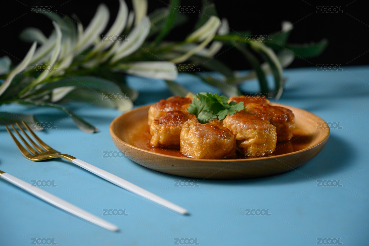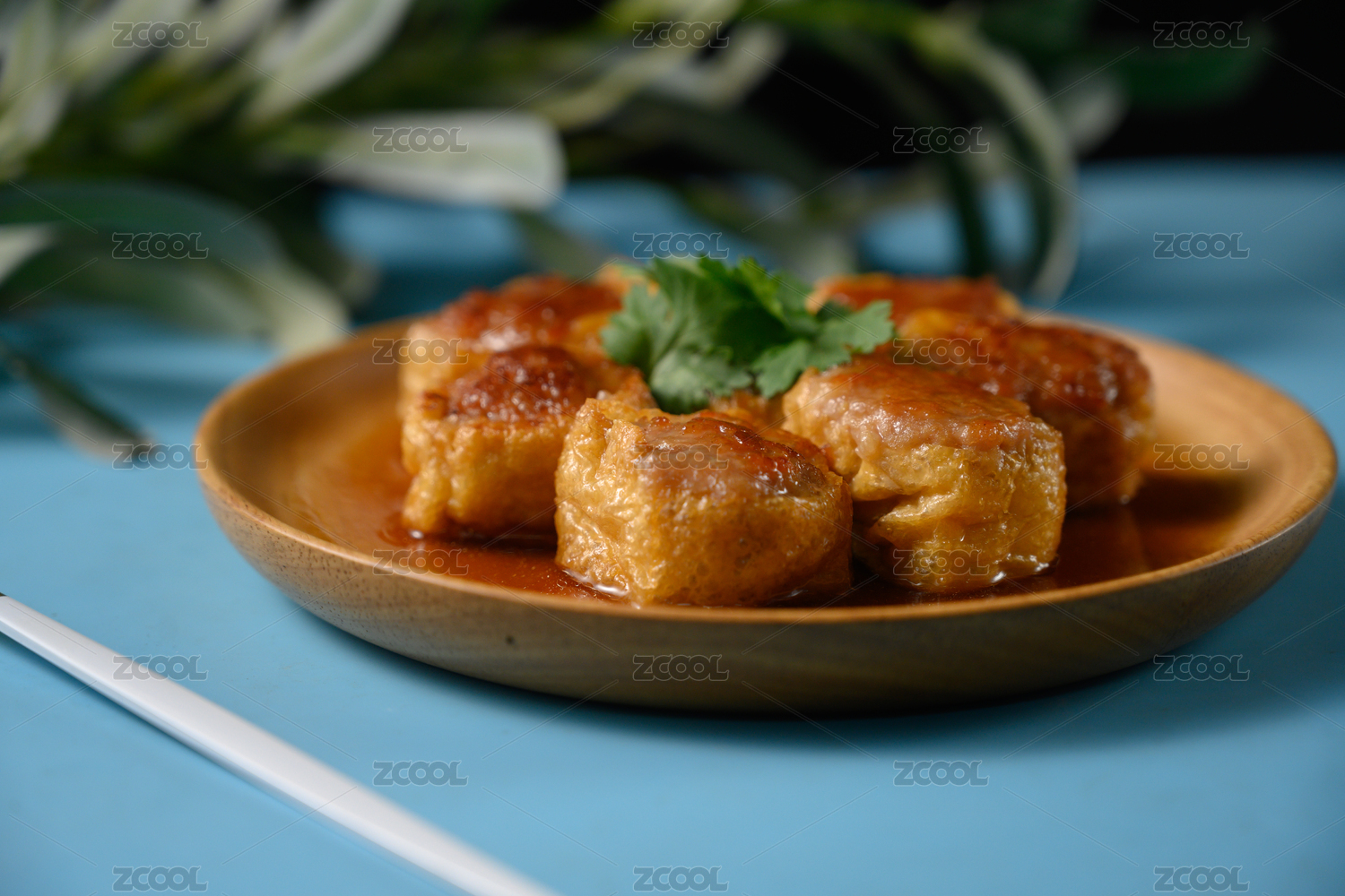 桌面上的盘子里的美味可口的煎酿豆腐