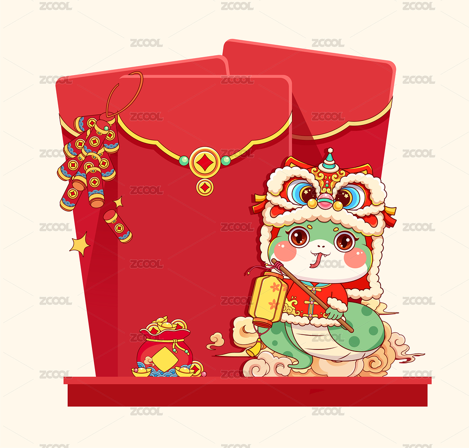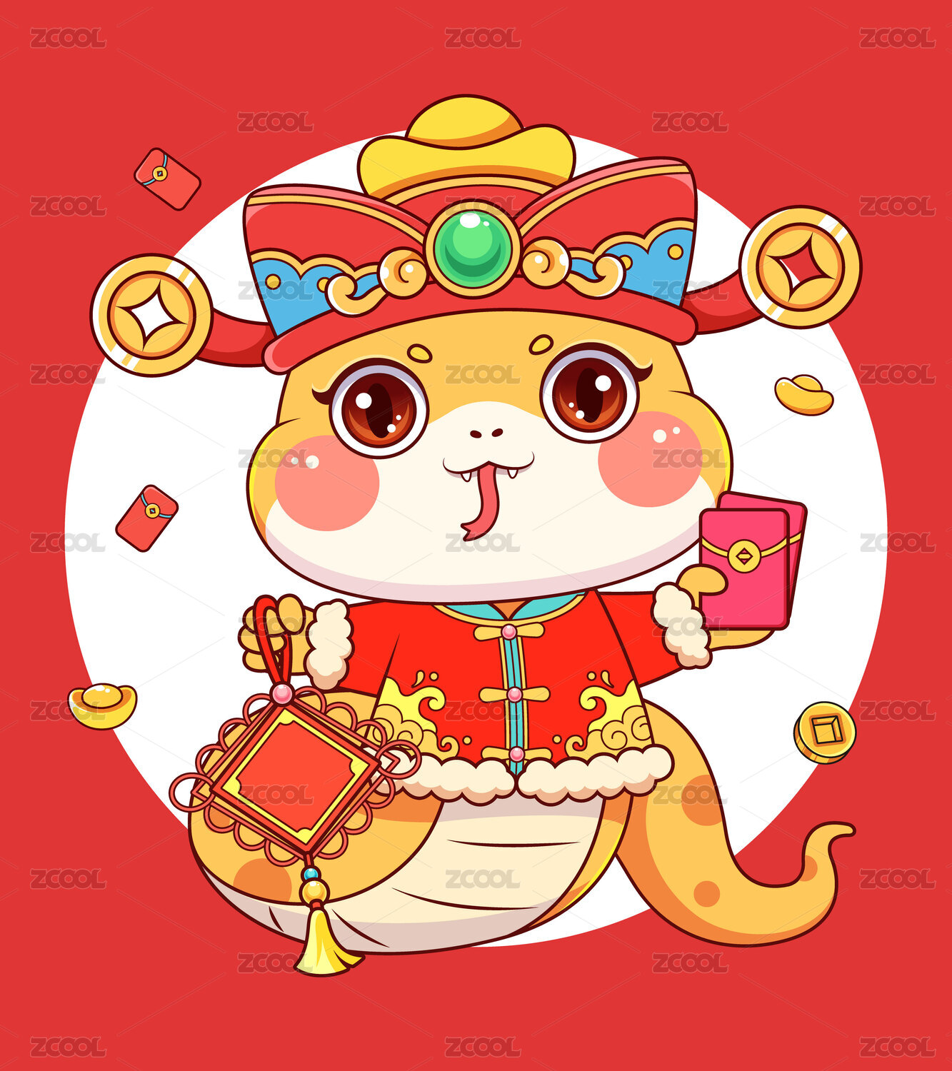 蛇年春节新年可爱卡通形象福禄元宝插画海报