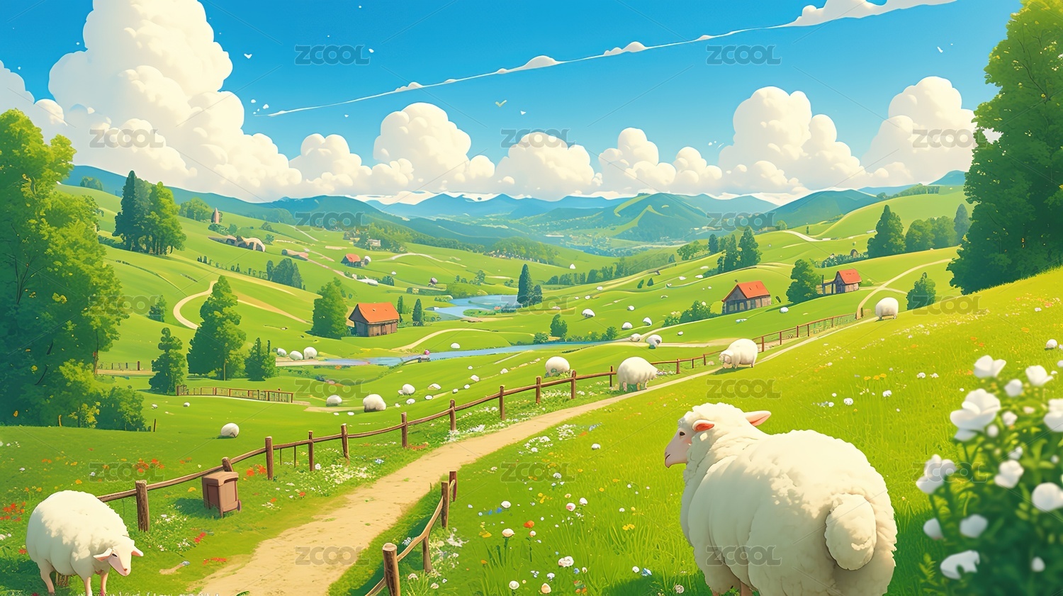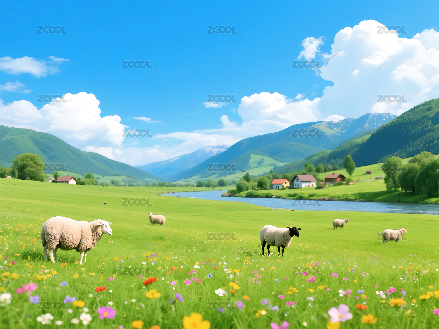 牧场,场景,草原,草坪,羊,牛,动物,家畜,户外,室外