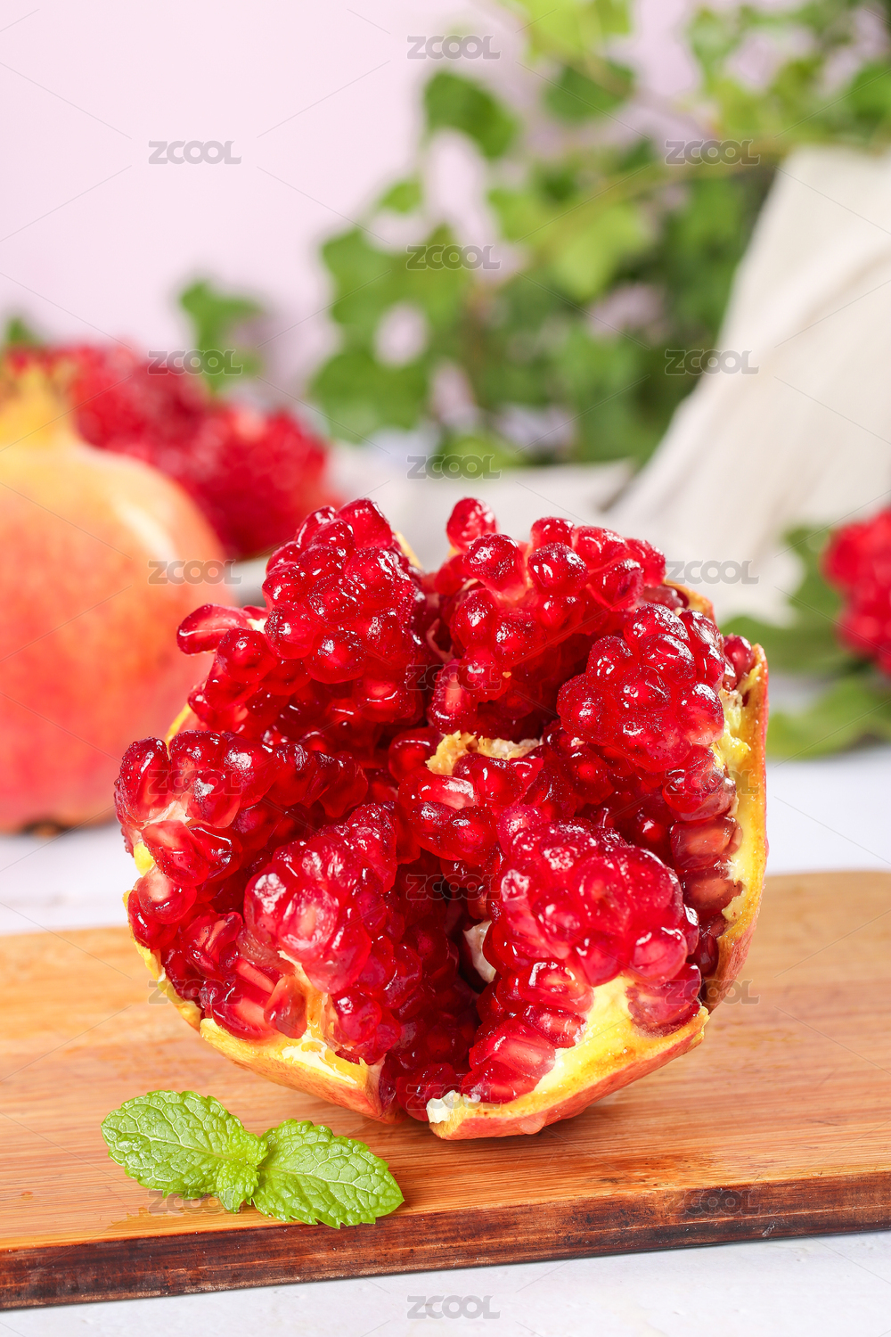 石底上放着新鲜会理石榴和掰开的软籽石榴