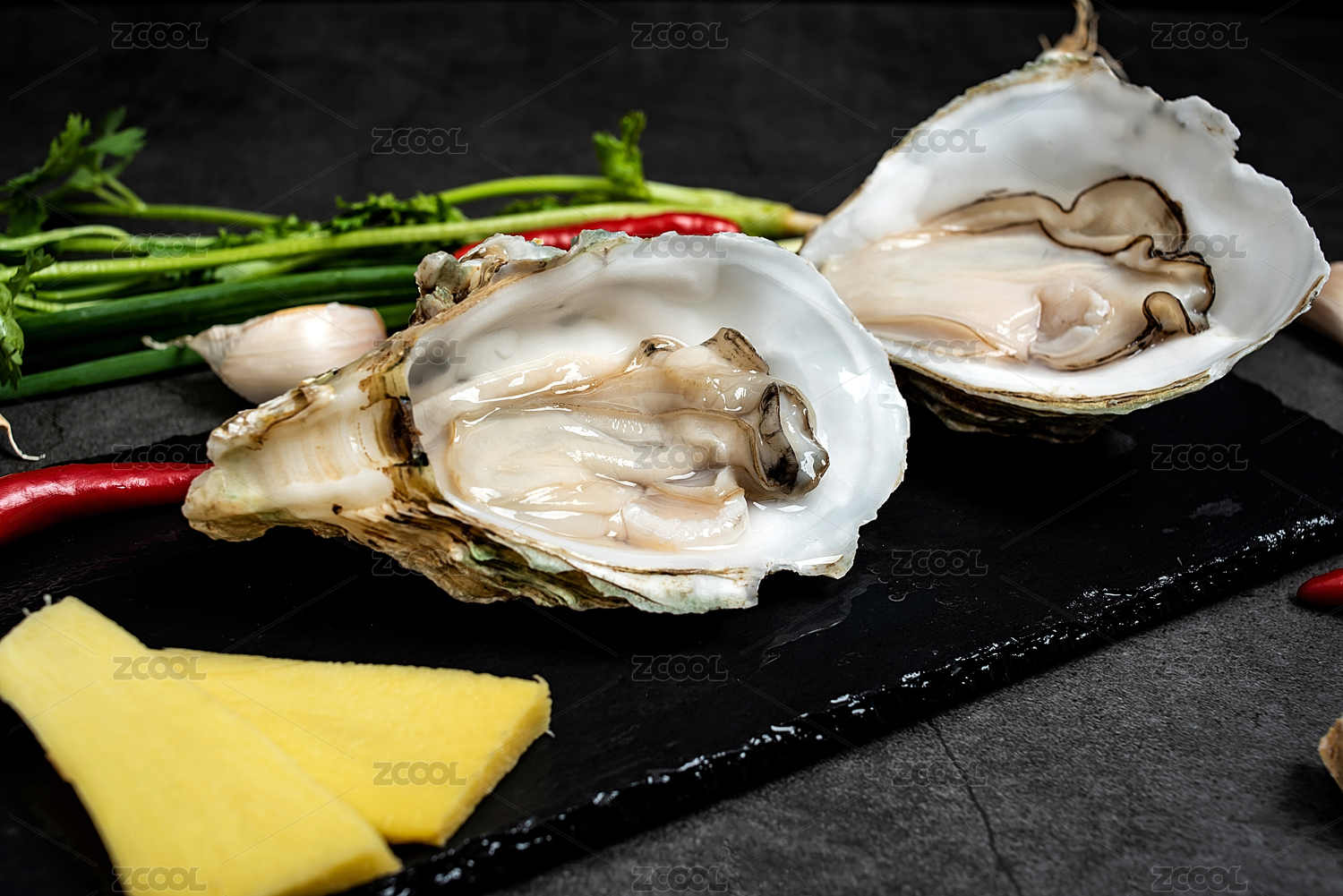 黑石底上放着一堆新鲜生蚝和撬开的海蛎子