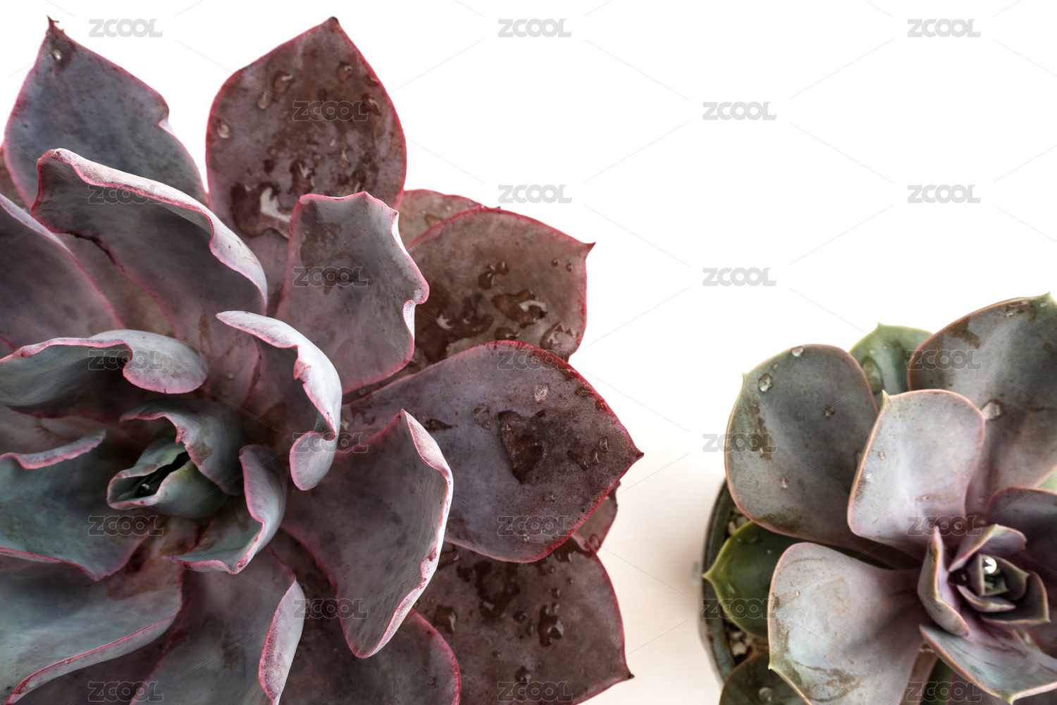 俯视白背景上带水珠的多肉植物石莲属晚霞局部特写