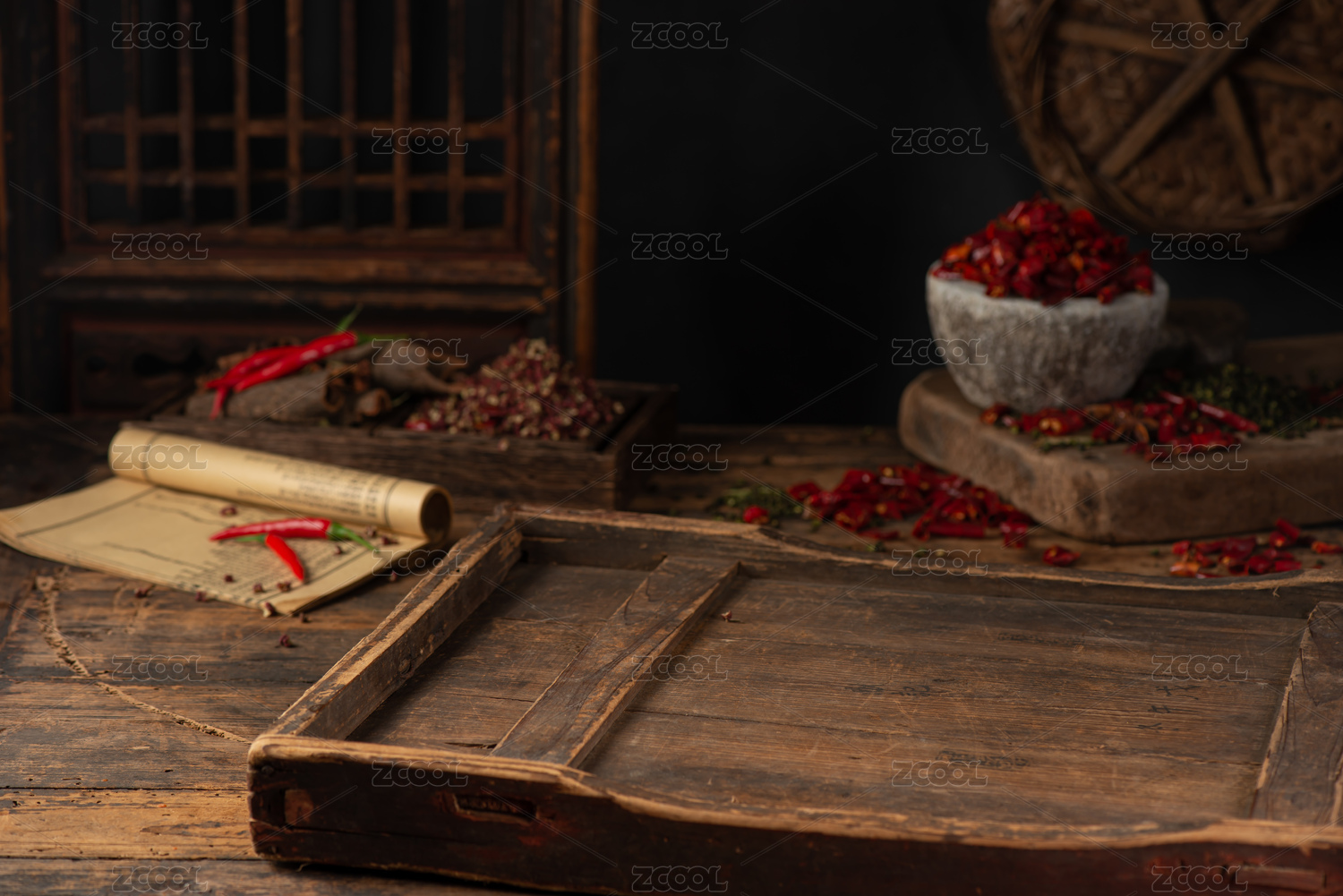 有木托盘石臼箩筐的中国风电商美食背景
