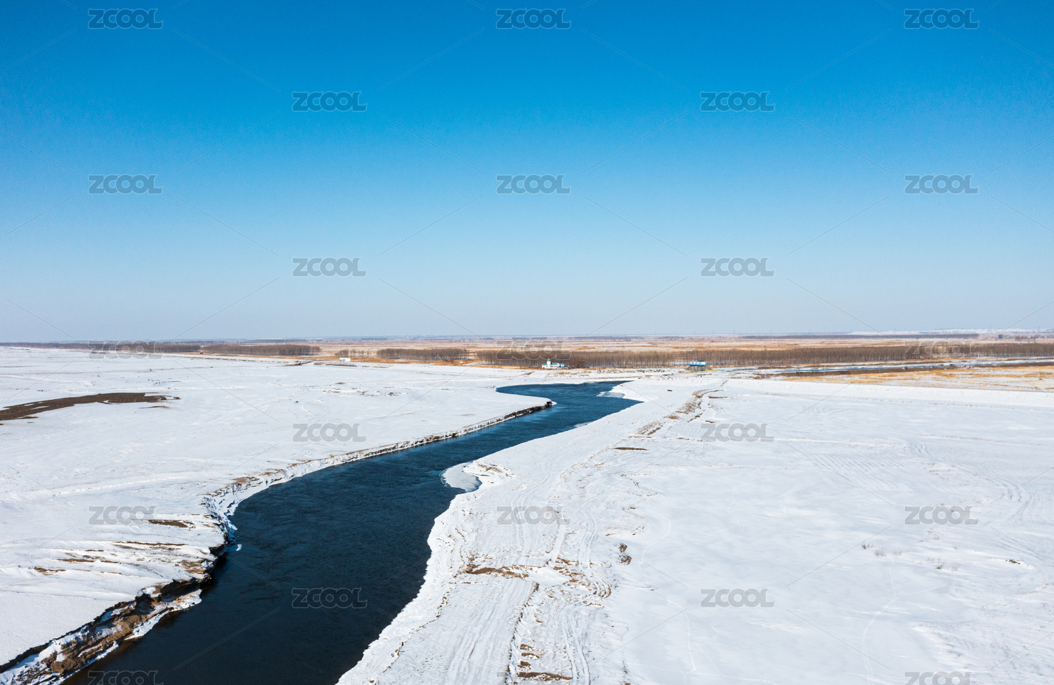 航拍东北冬季不冻河