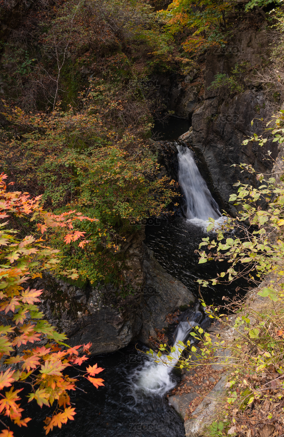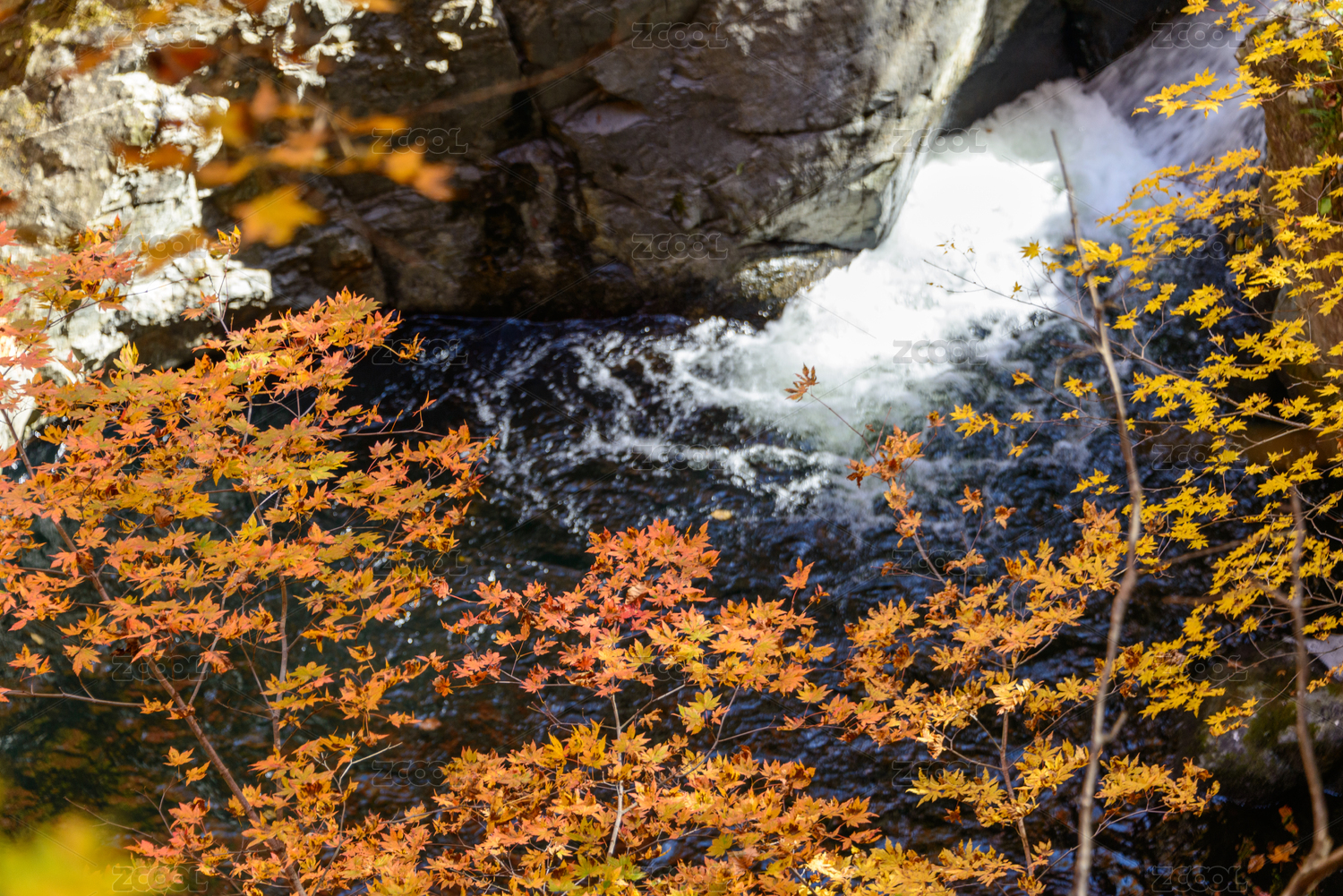 山涧红色枫叶流瀑,中国山东省济南市九如山