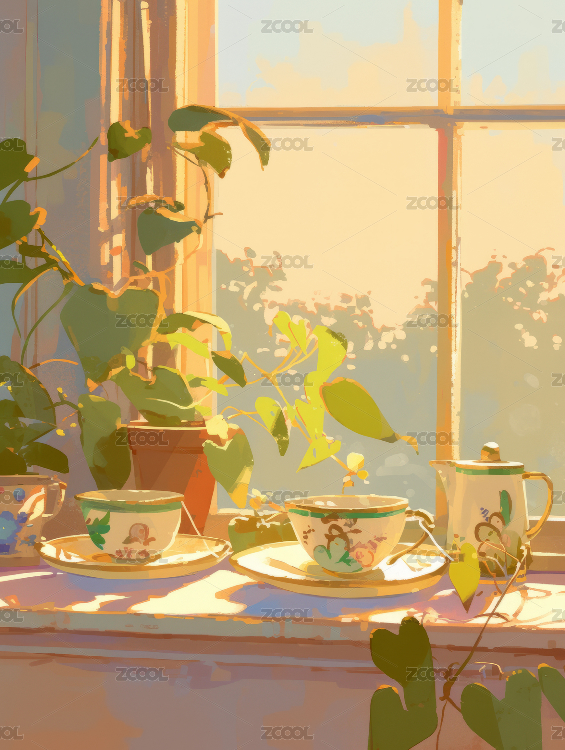 室内咖啡杯植物窗户唯美插画