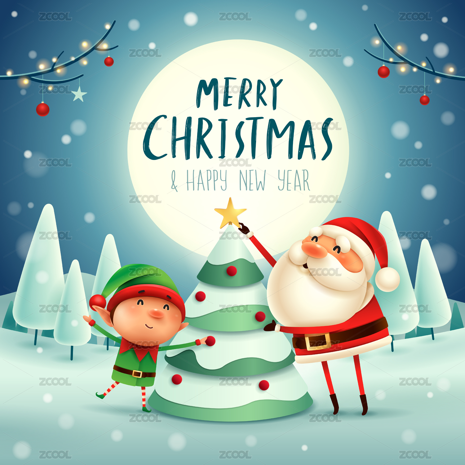 圣诞老人和小精灵装饰圣诞树在月光下。冬季景观。