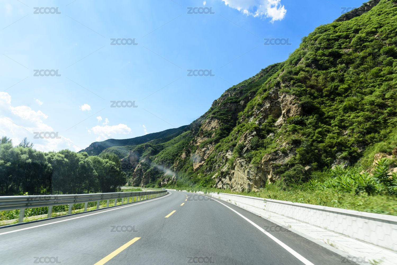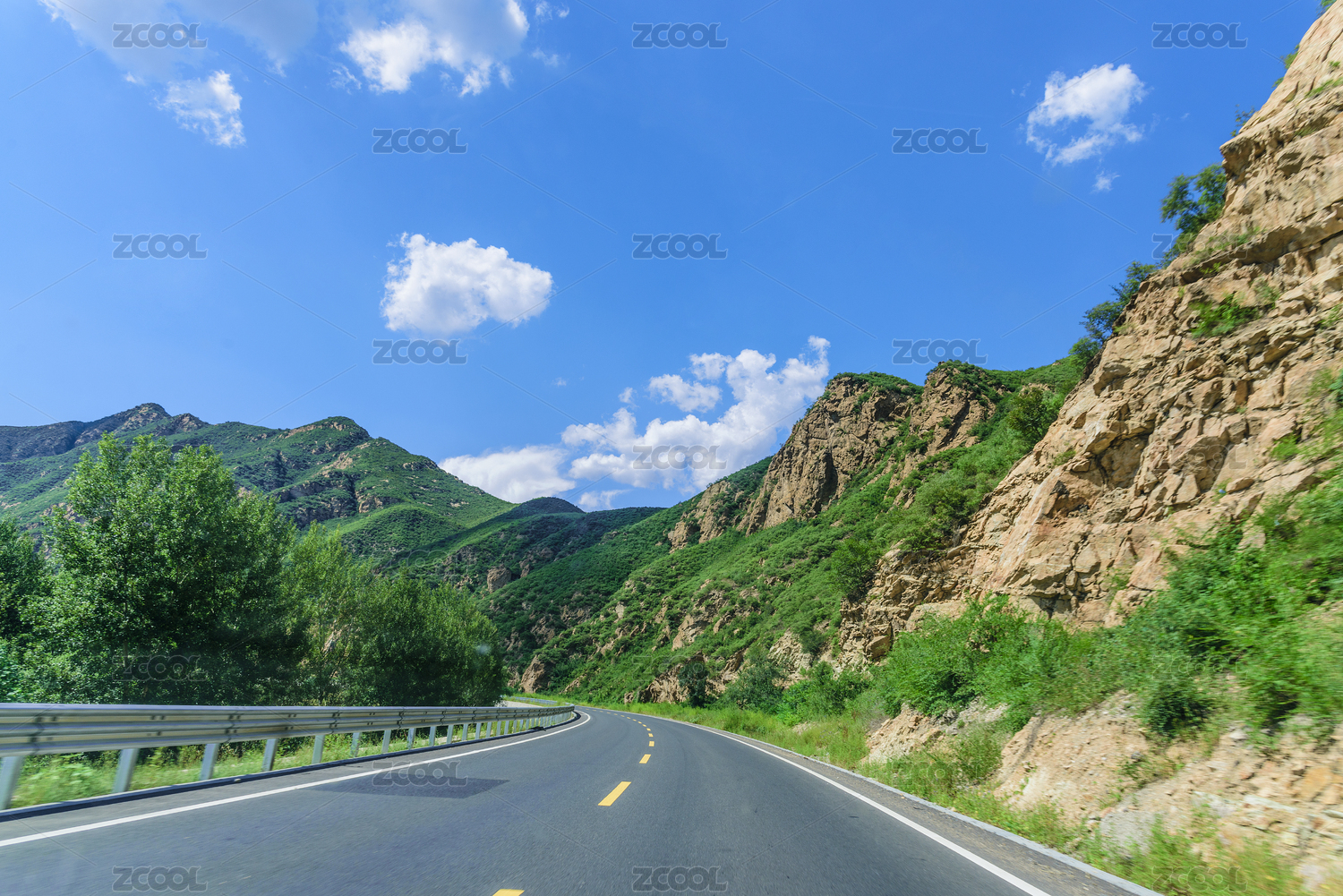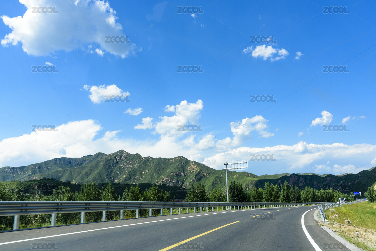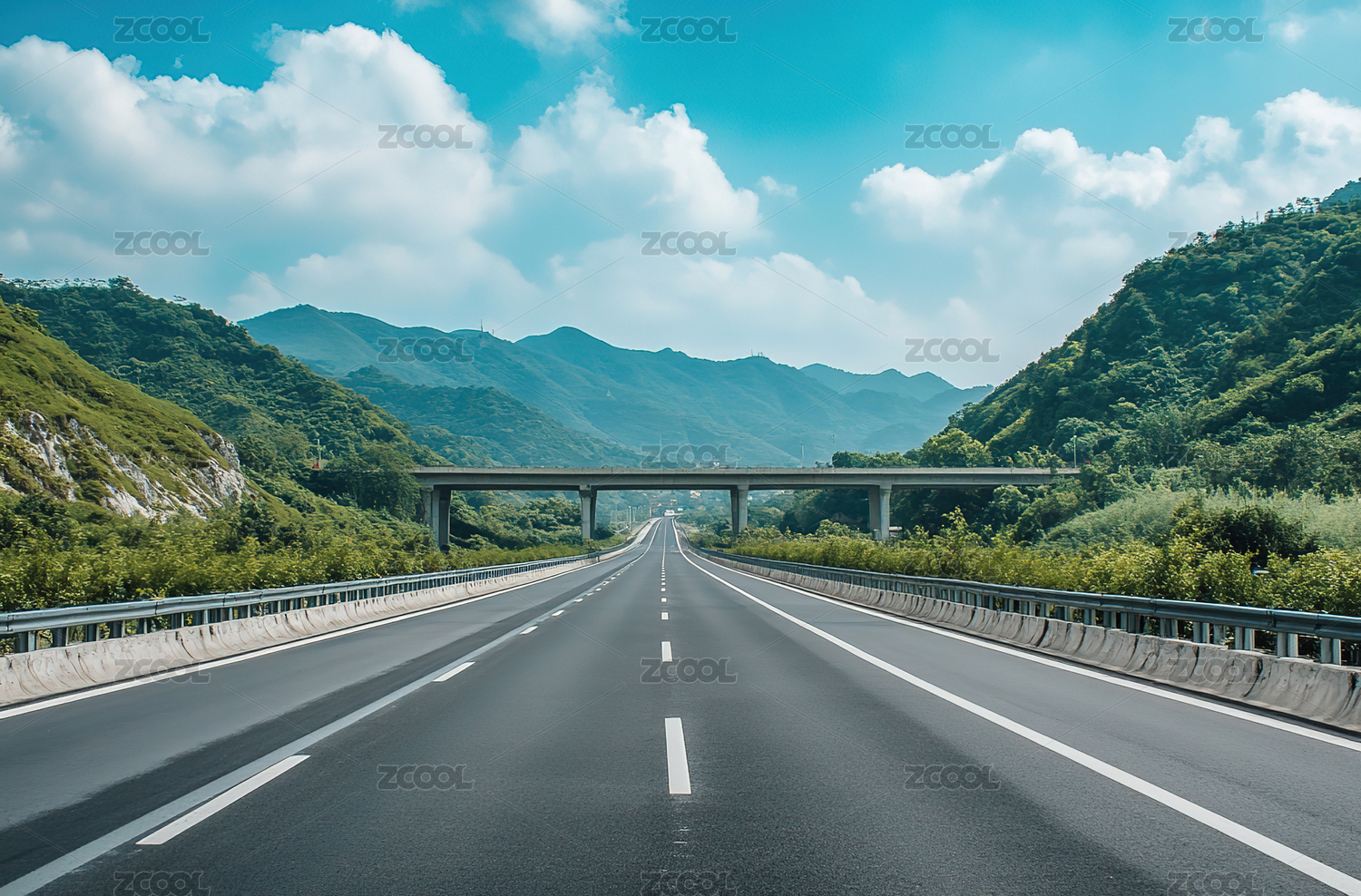 晴朗天气蓝天白云下的山区宽阔的沥青公路