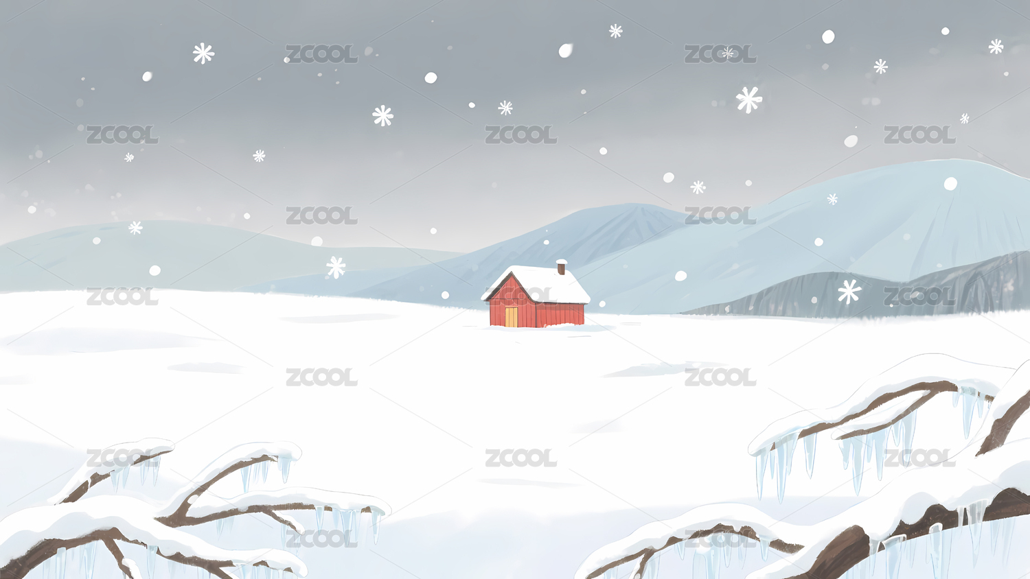 冬天晴朗无人白雪覆盖的原野上亮灯的小屋插
