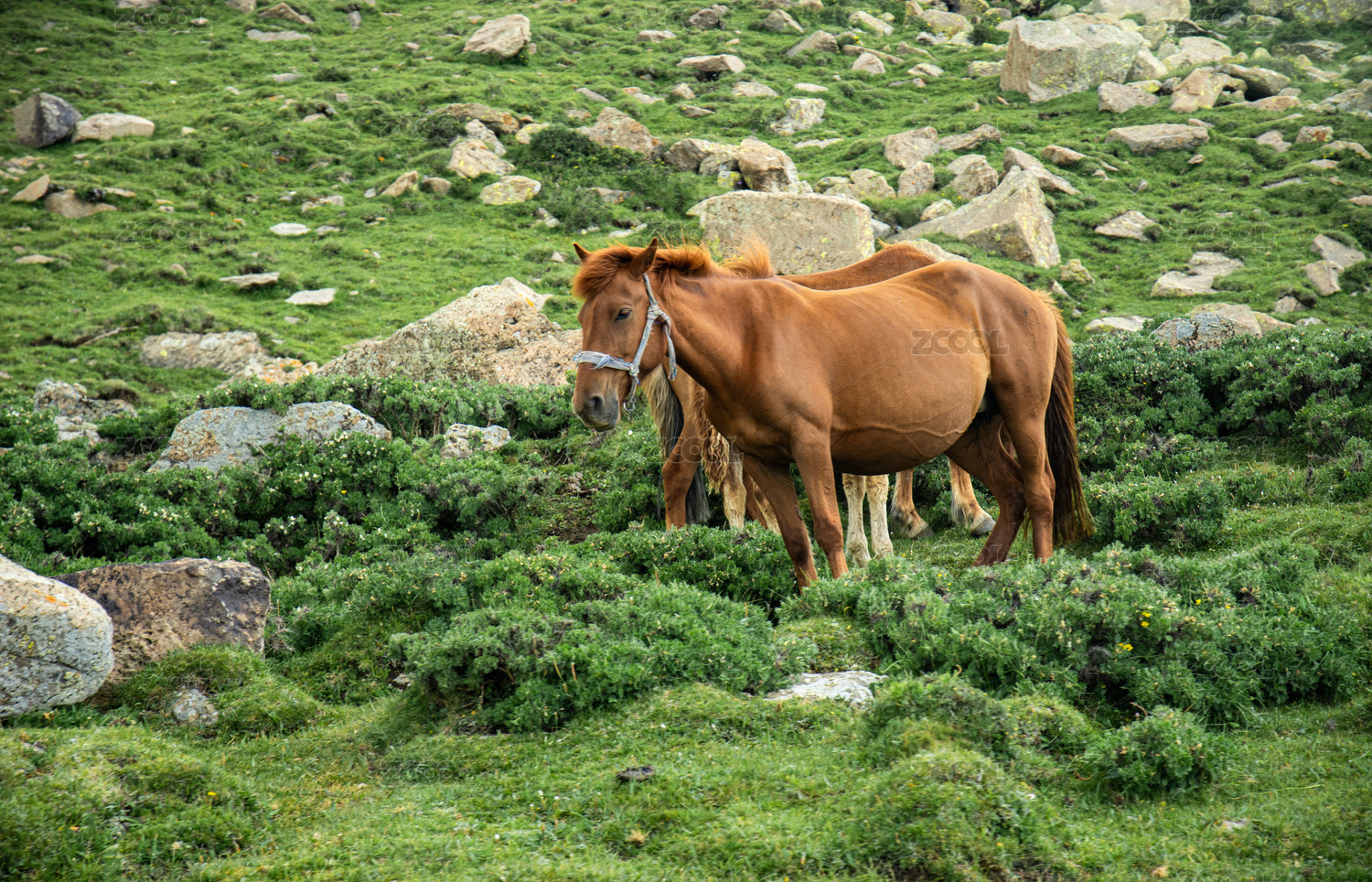 山谷草原上吃草的马儿