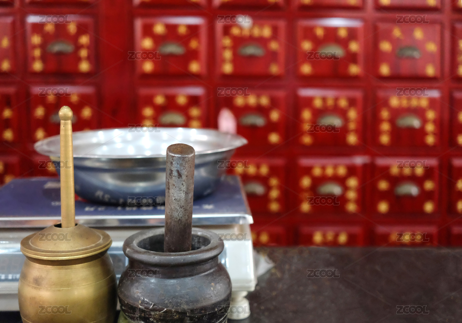 中药臼子放在中药柜前