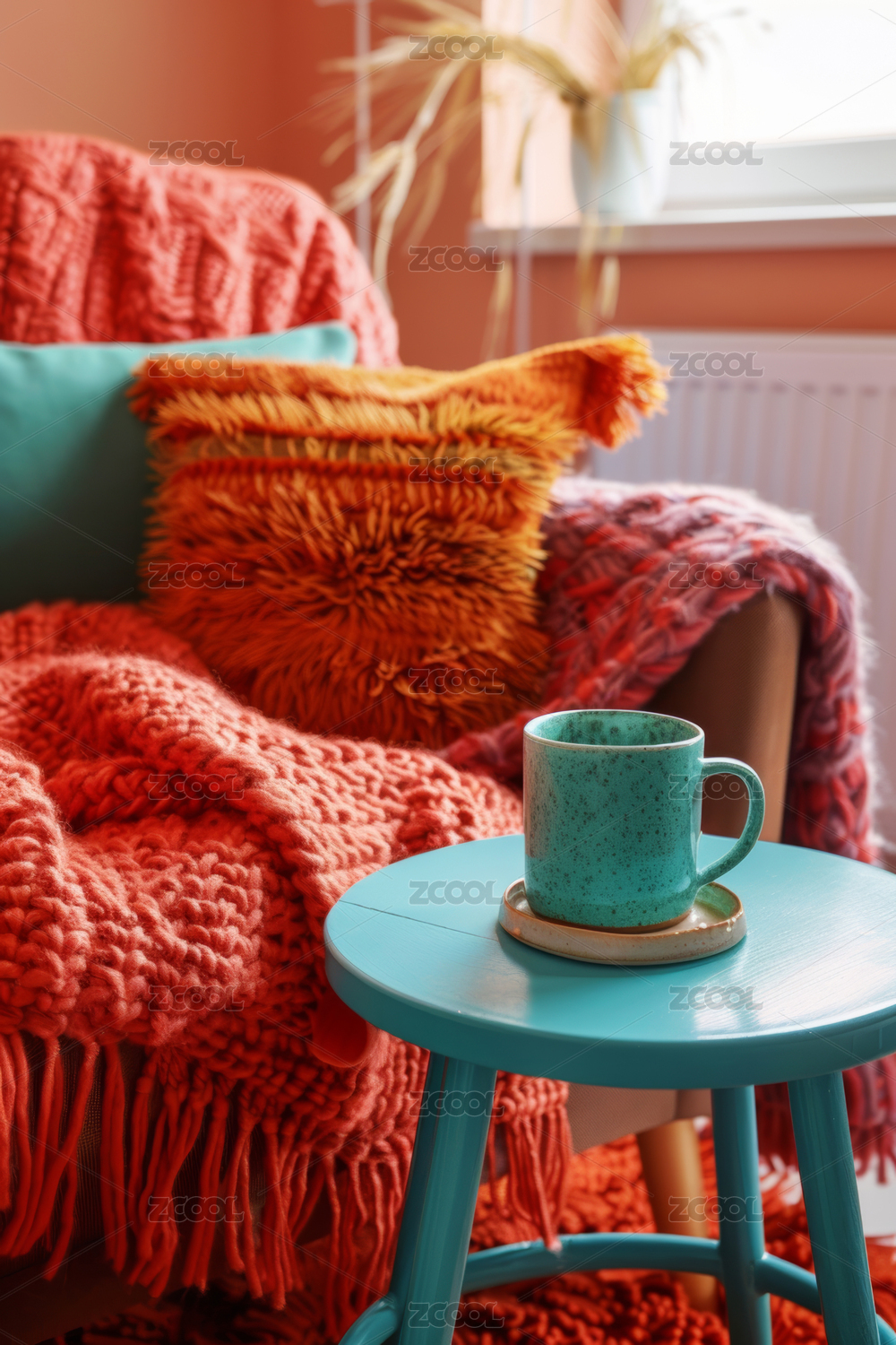 沙发上红色抱枕和毛毯,桌子的马克杯