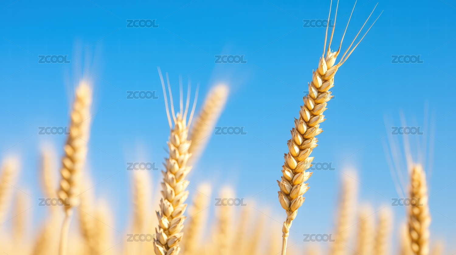 仰拍金黄色的小麦田里几株伸向天空的高挑小麦穗