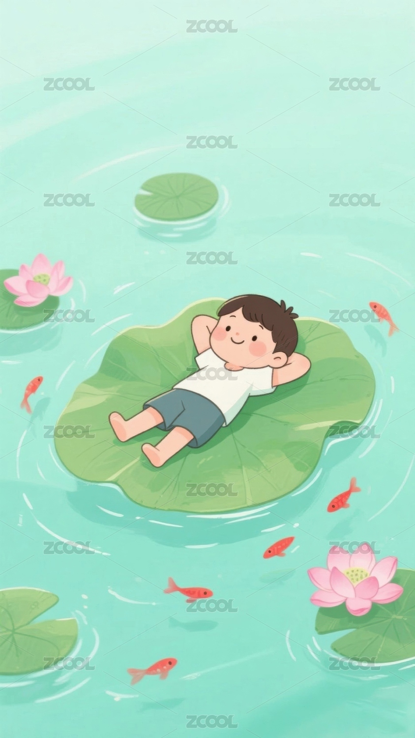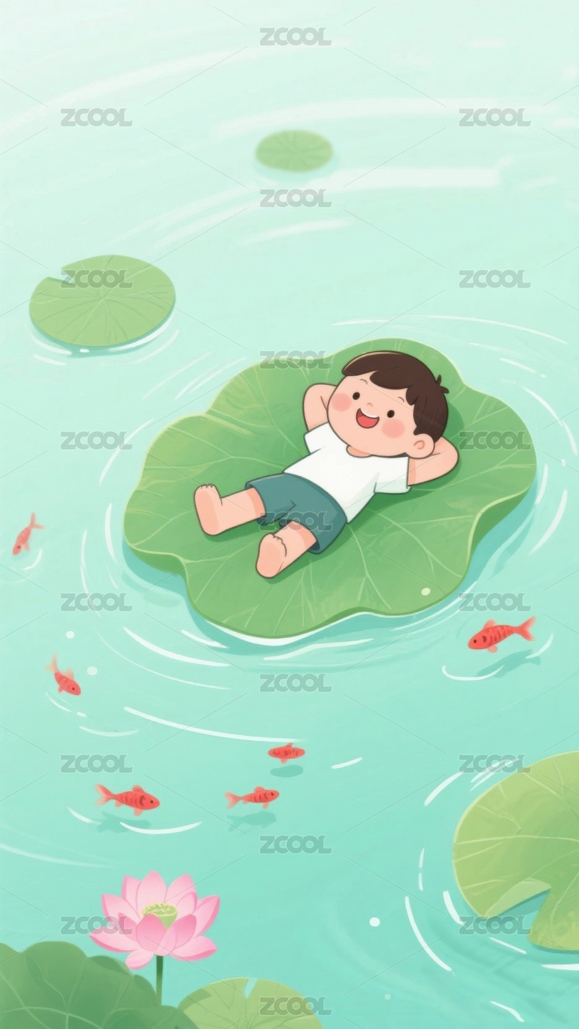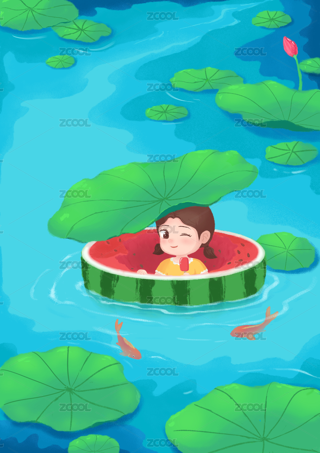 夏天躺在荷叶上吃西瓜纳凉的小女孩手绘插画