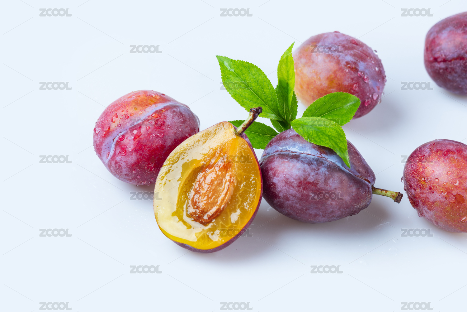 西梅,水果,新鲜,剖面,李子,美食,水珠,绿叶,圆木盘