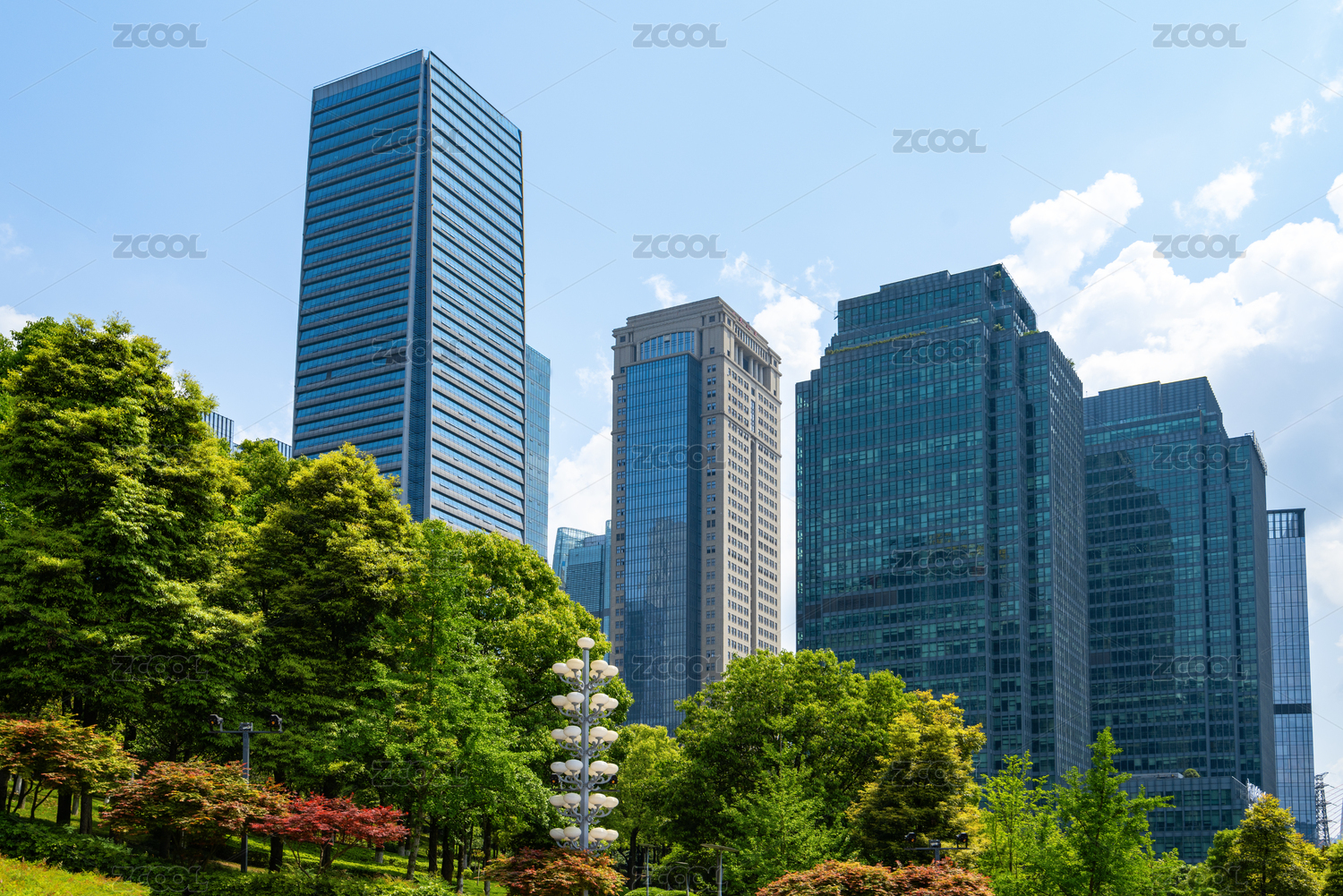 武汉晴朗夏季白天蓝天白云天空下的写字楼