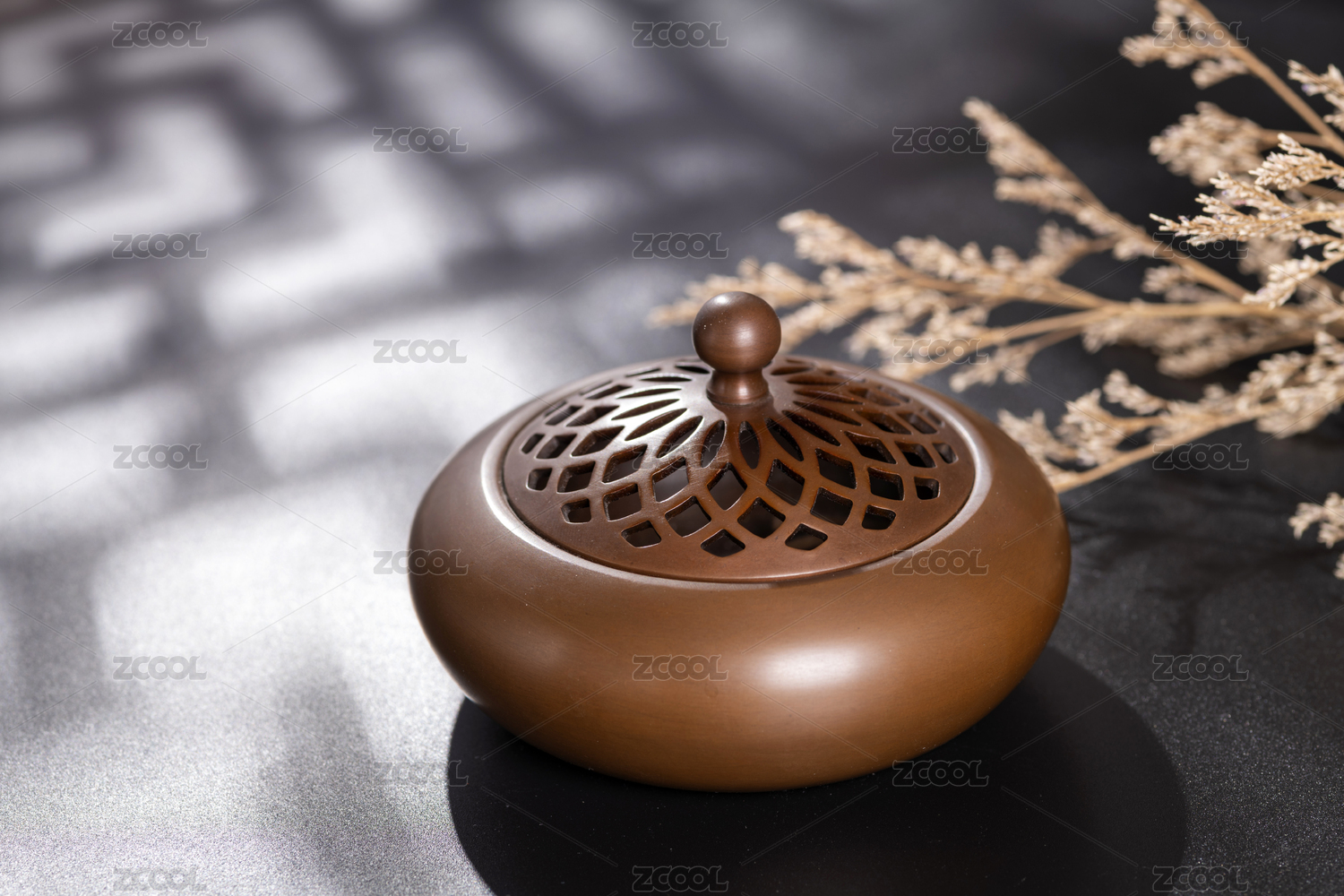 摆放在深色桌面上的造型古朴的紫铜香炉