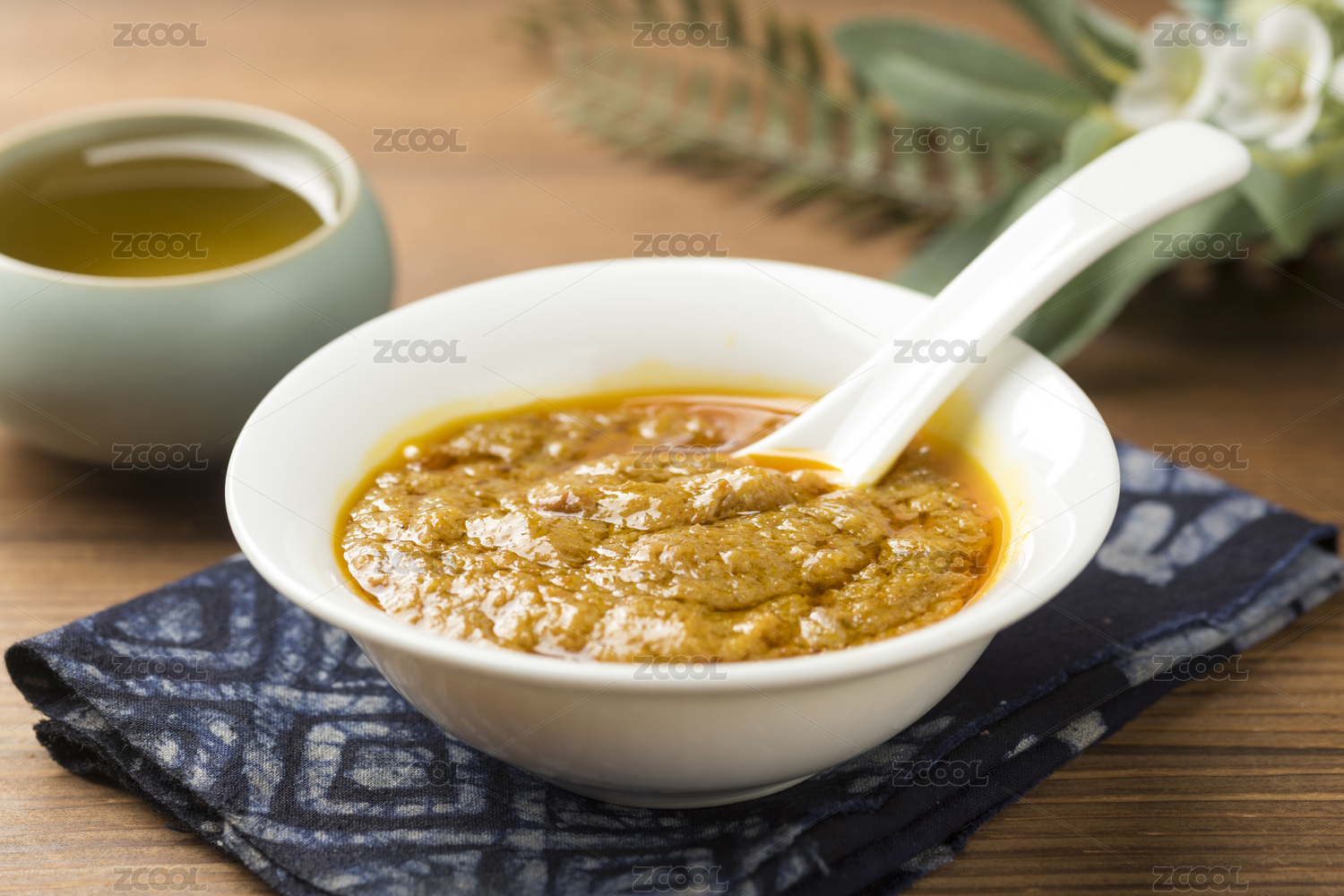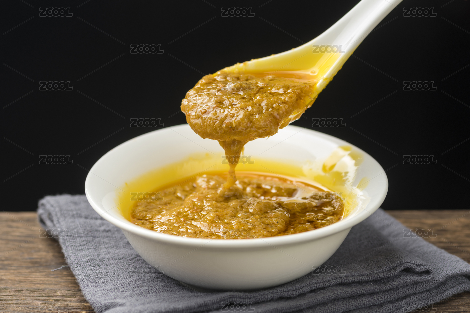 蟹黄鲜酱摆放在桌面上勺盛蟹黄酱特写