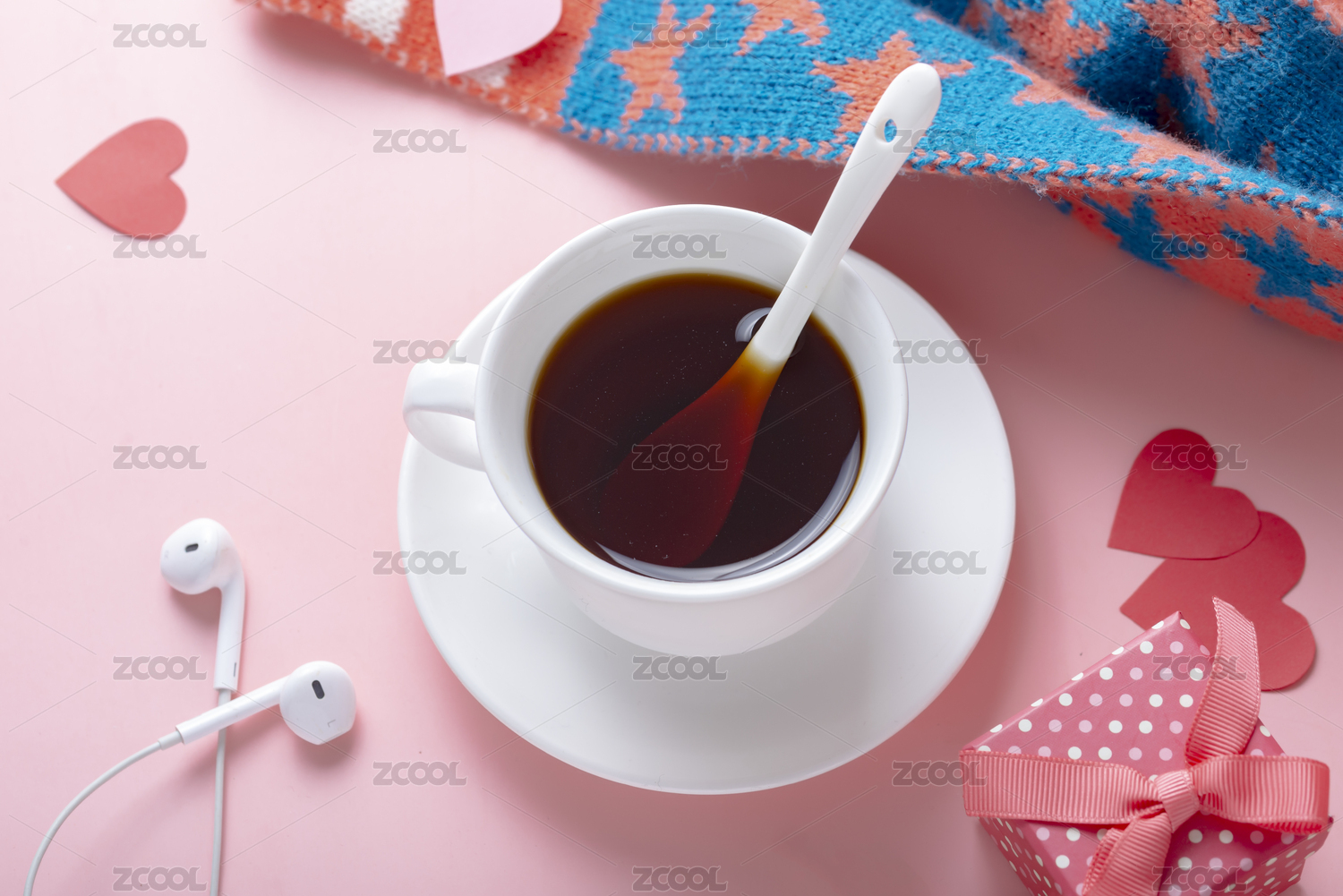 粉色,背景,桌面,围巾,咖啡,耳机,温暖,冬天,取暖,无人