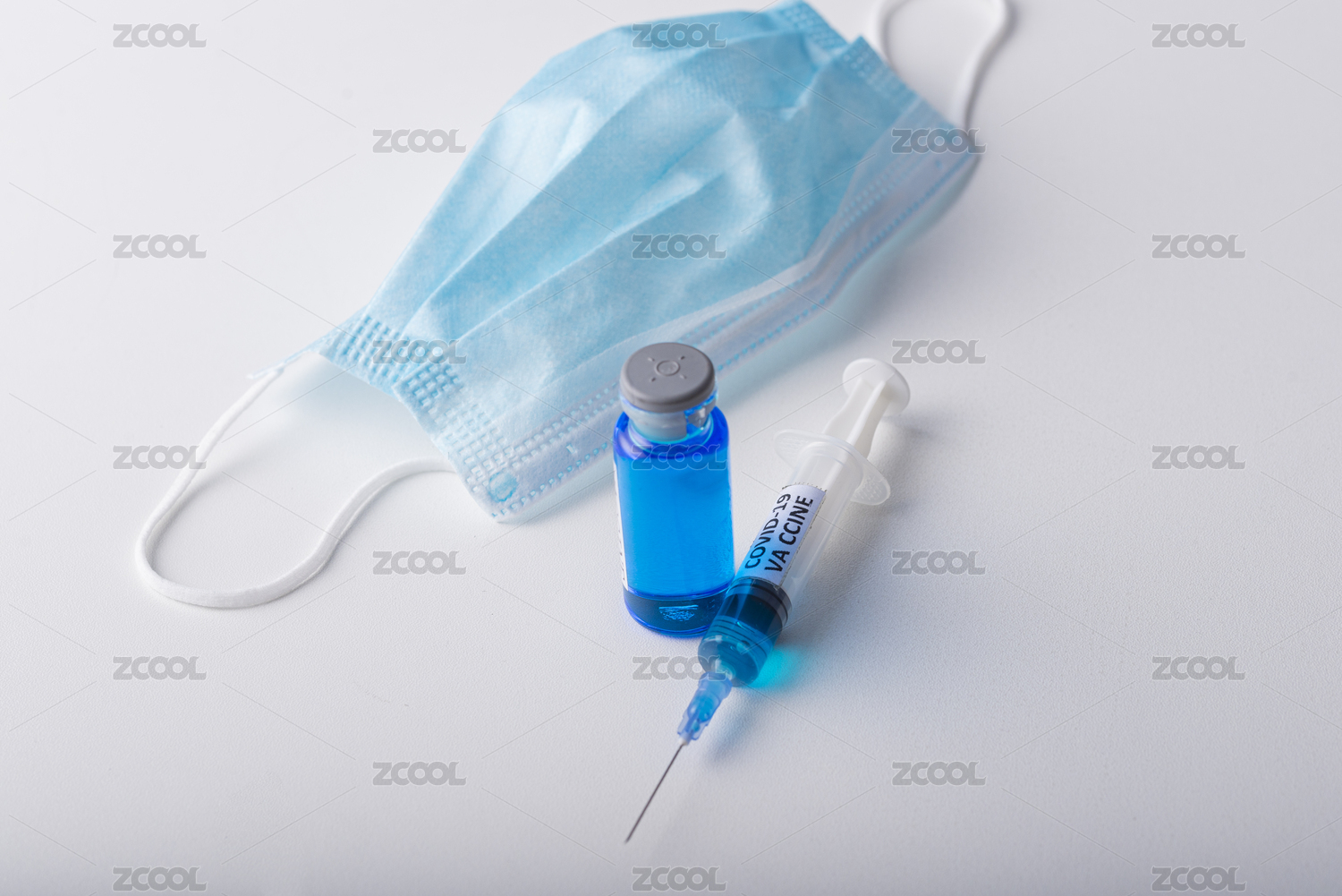 注射器、胶囊、药瓶和口罩放在白色背景上