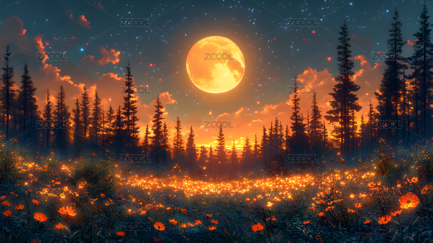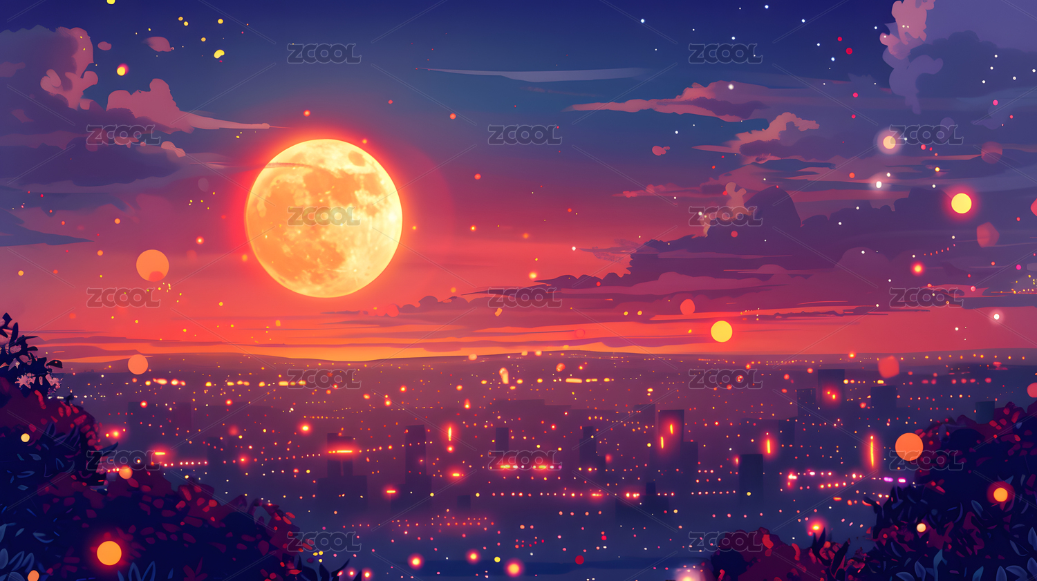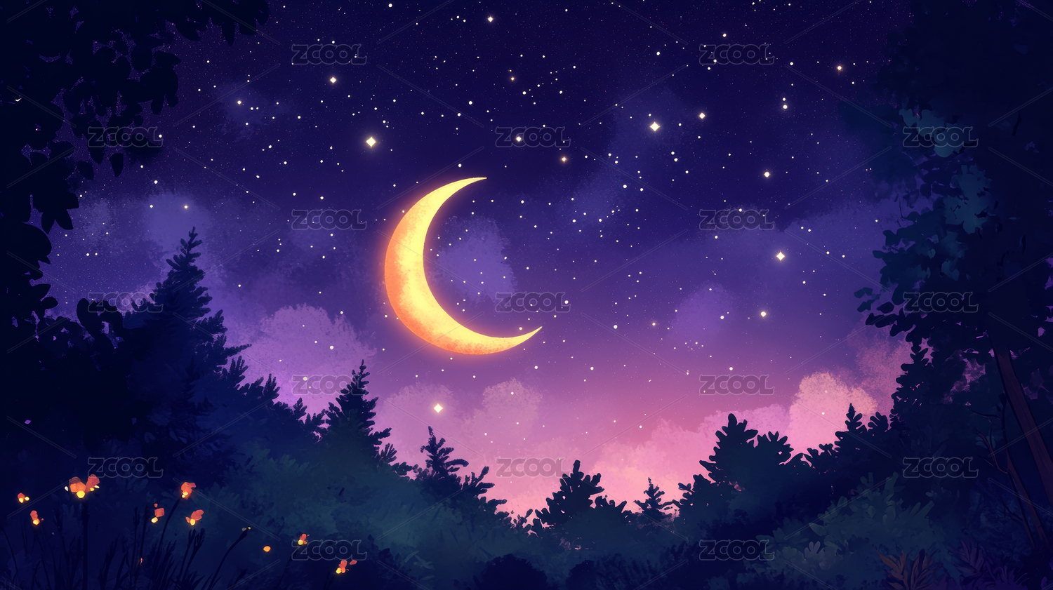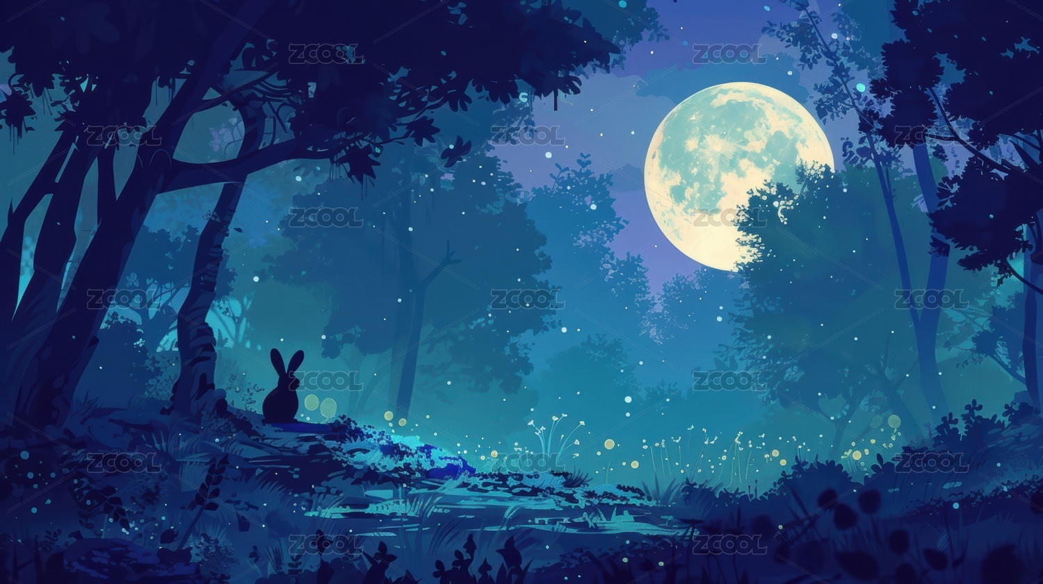 一只兔子在夜晚的山林间望向月亮的插画背景