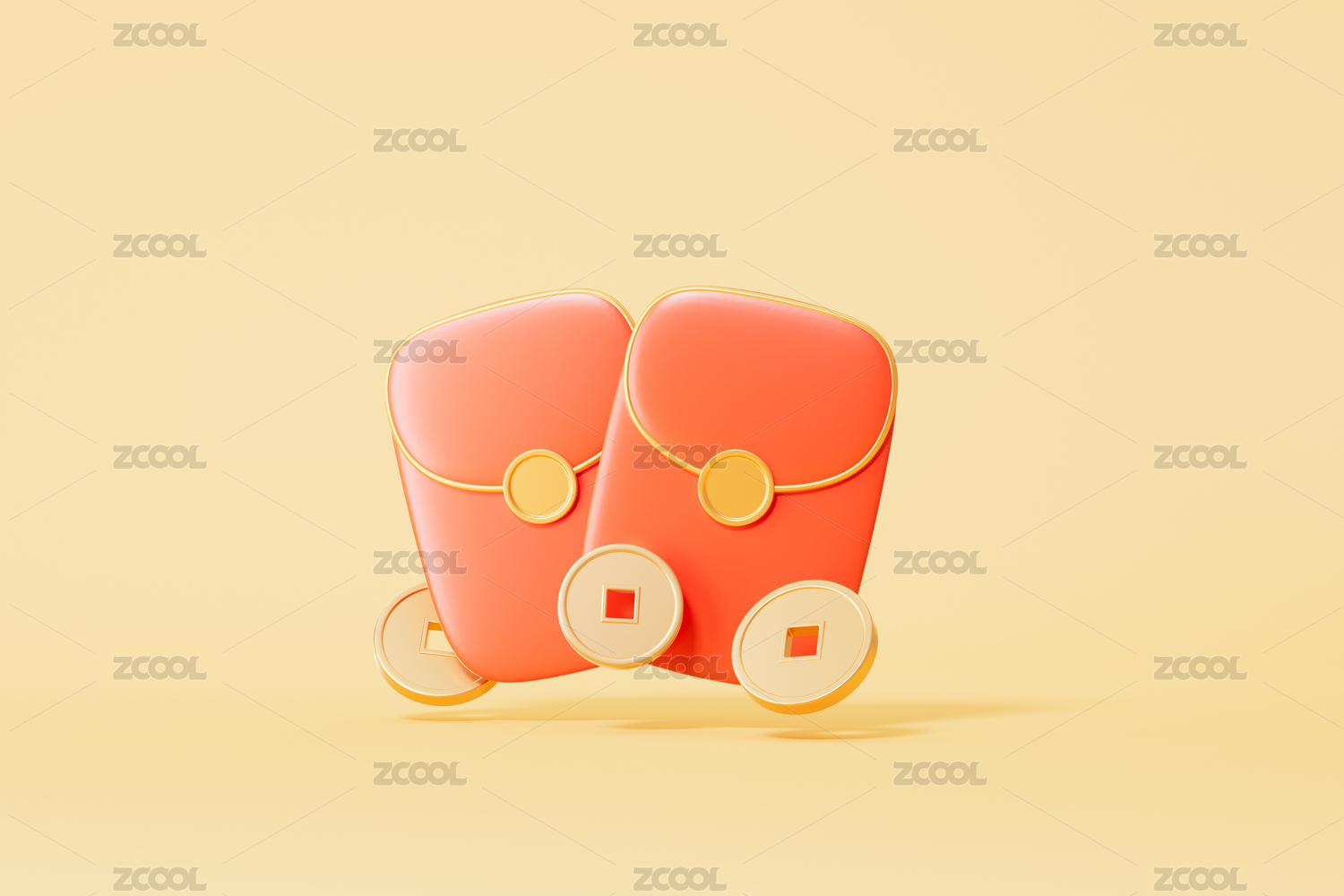 黄色背景下的中国风红包与铜钱