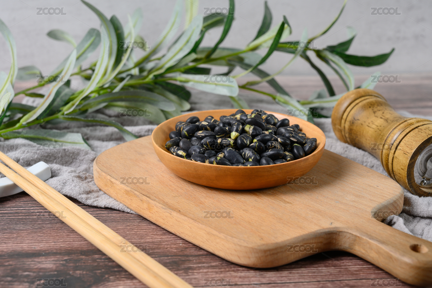 桌面上的盘子里的黑枸杞和杯子里的黑枸杞茶