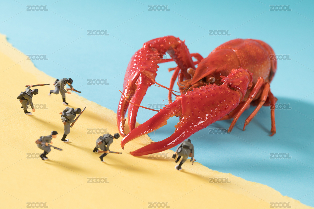 迷你小人,小龙虾,微拍小龙虾,缩微摄影小龙虾,crawfish,黄底,战斗,迷你小人和小龙虾,Crawfish,Crayfish