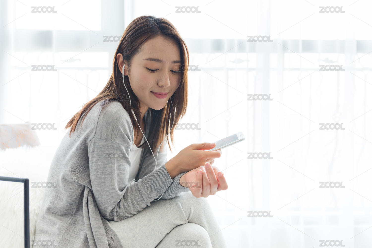 年轻女性侧身坐在客厅窗边沙发上低头微笑听音乐