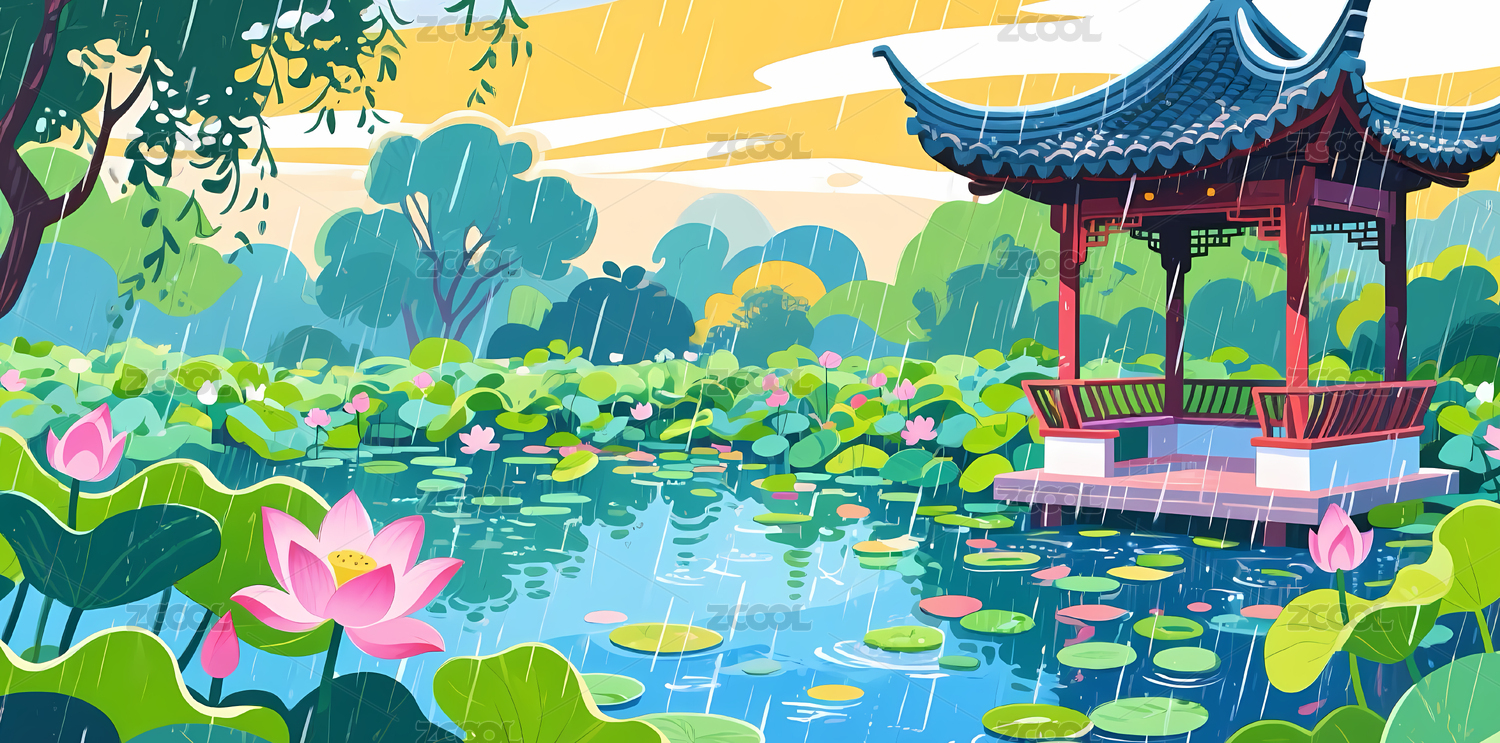 雨中荷塘亭台