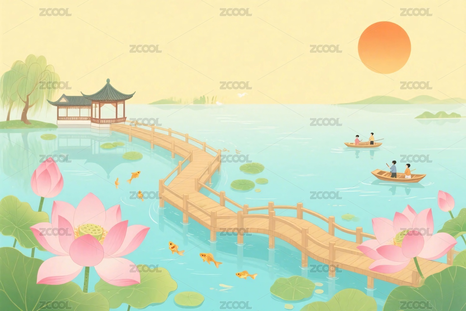 夏至插画公园里湖边凉亭,湖里开满荷叶荷花