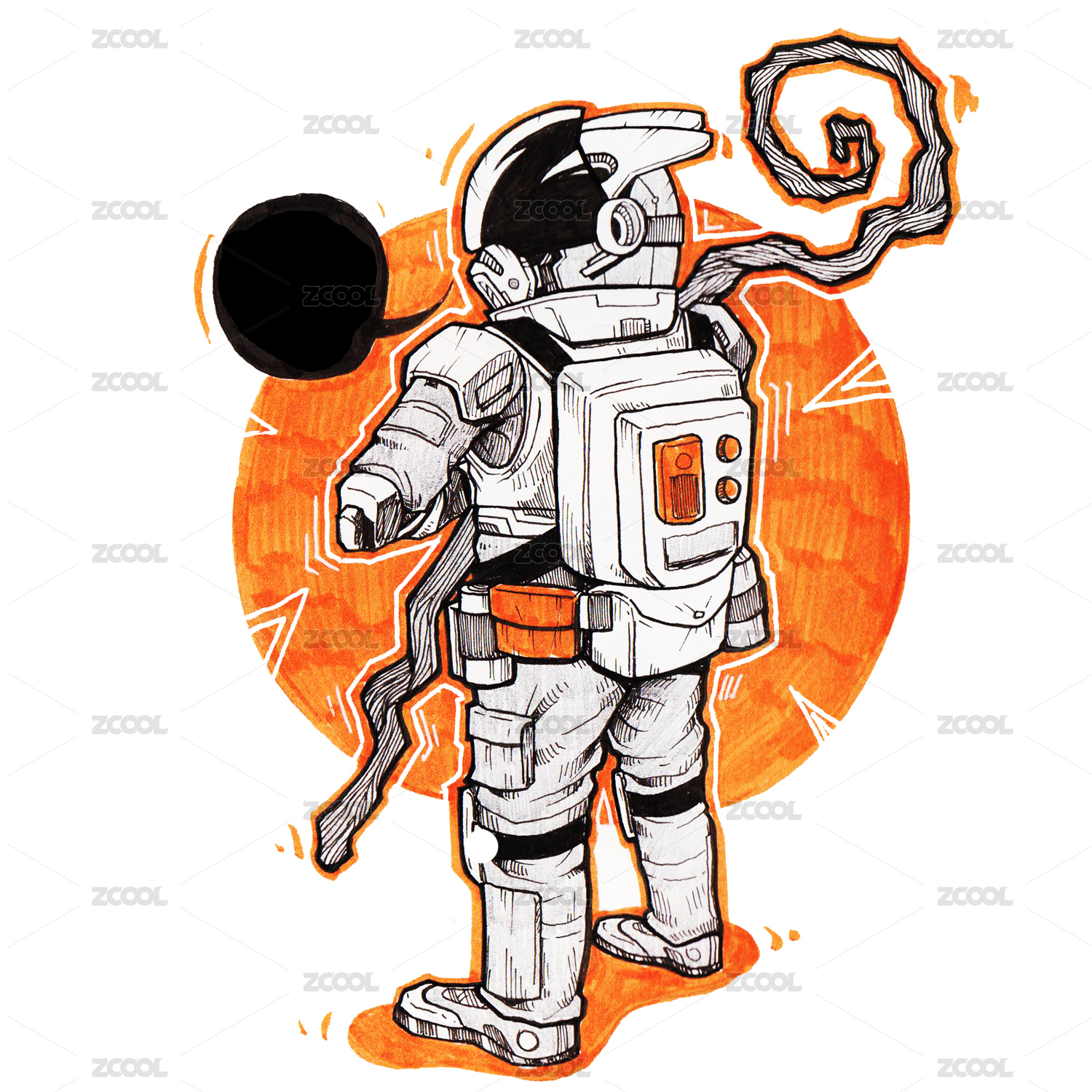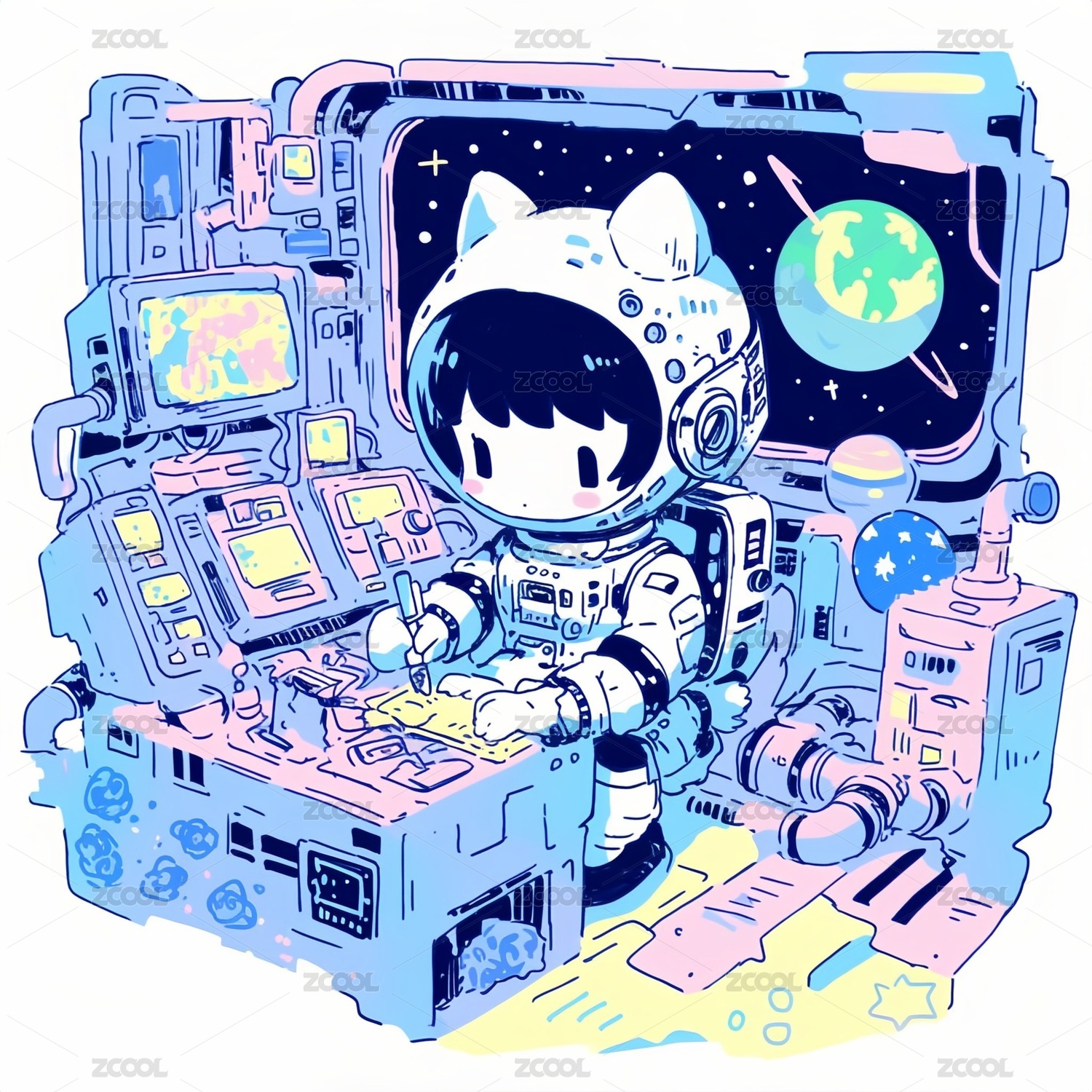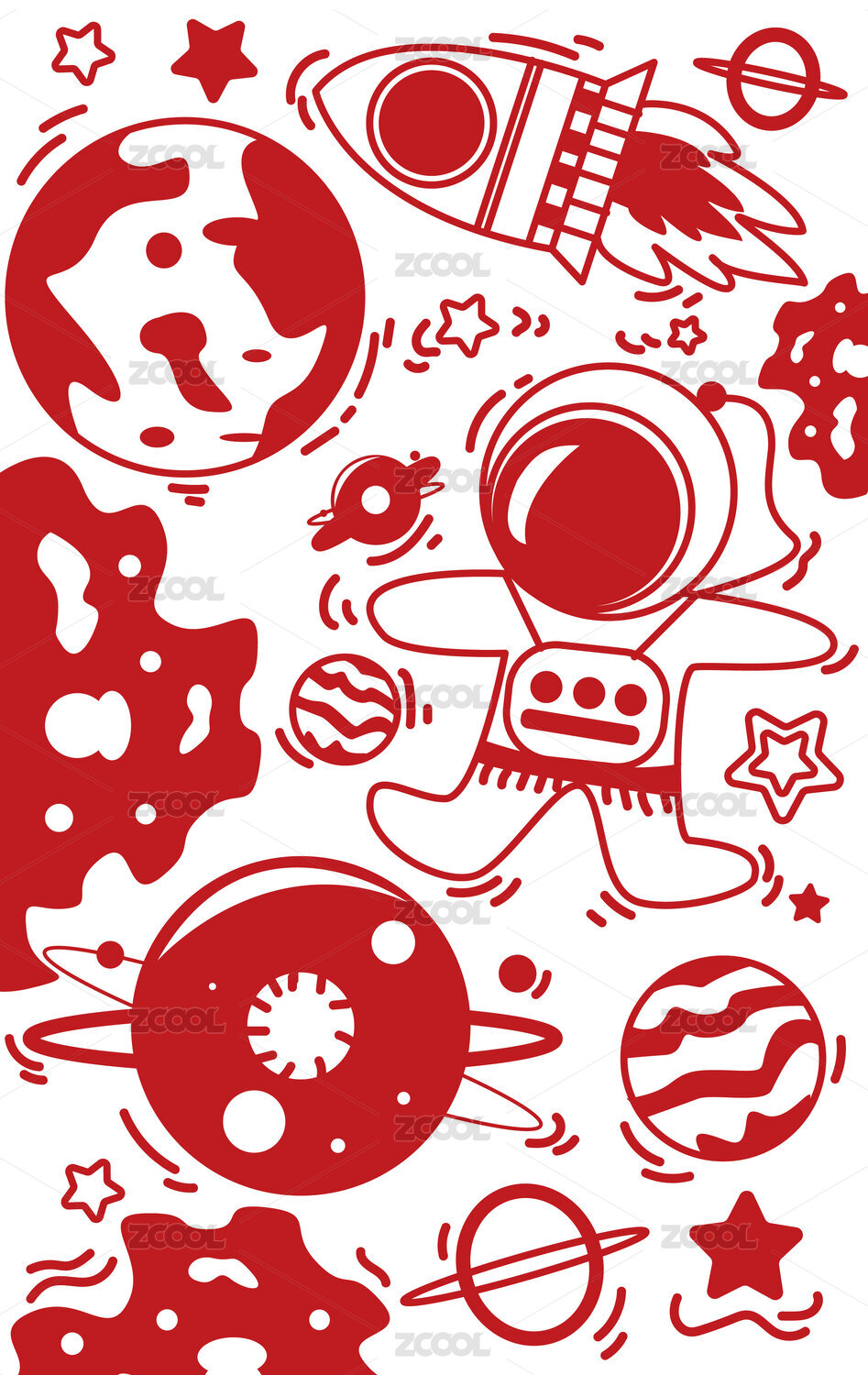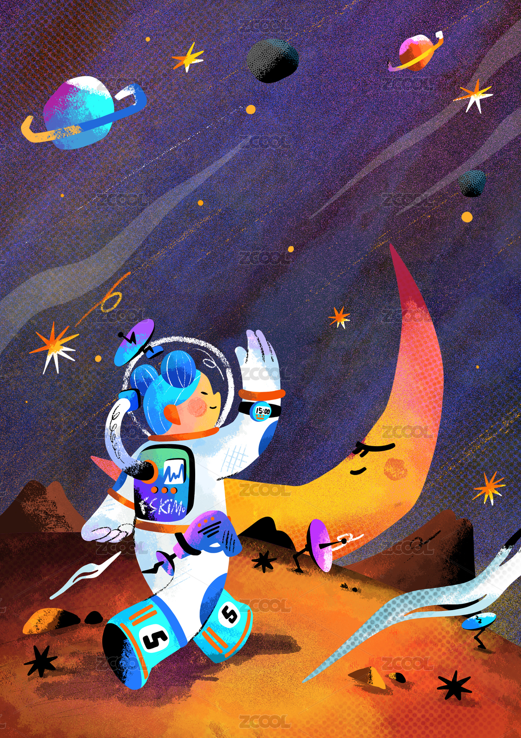 矢量手绘宇宙科技飞船宇航员太空插画中国风