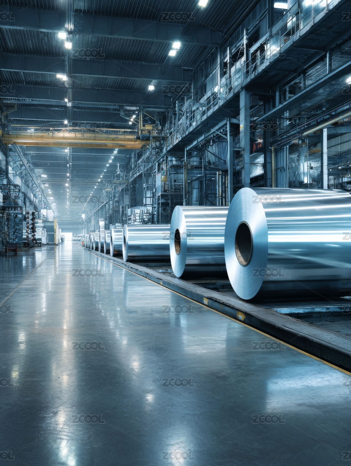 明亮先进的的现代工厂库房内整齐排列着钢卷