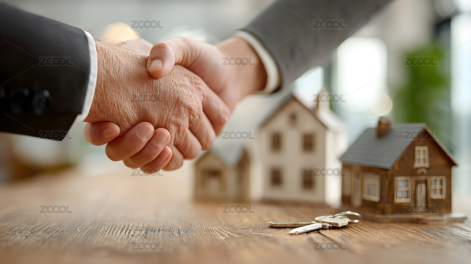 房屋代理销售成功的建筑方案概念 - 业务小姐与投资者买家完成交易,握手。