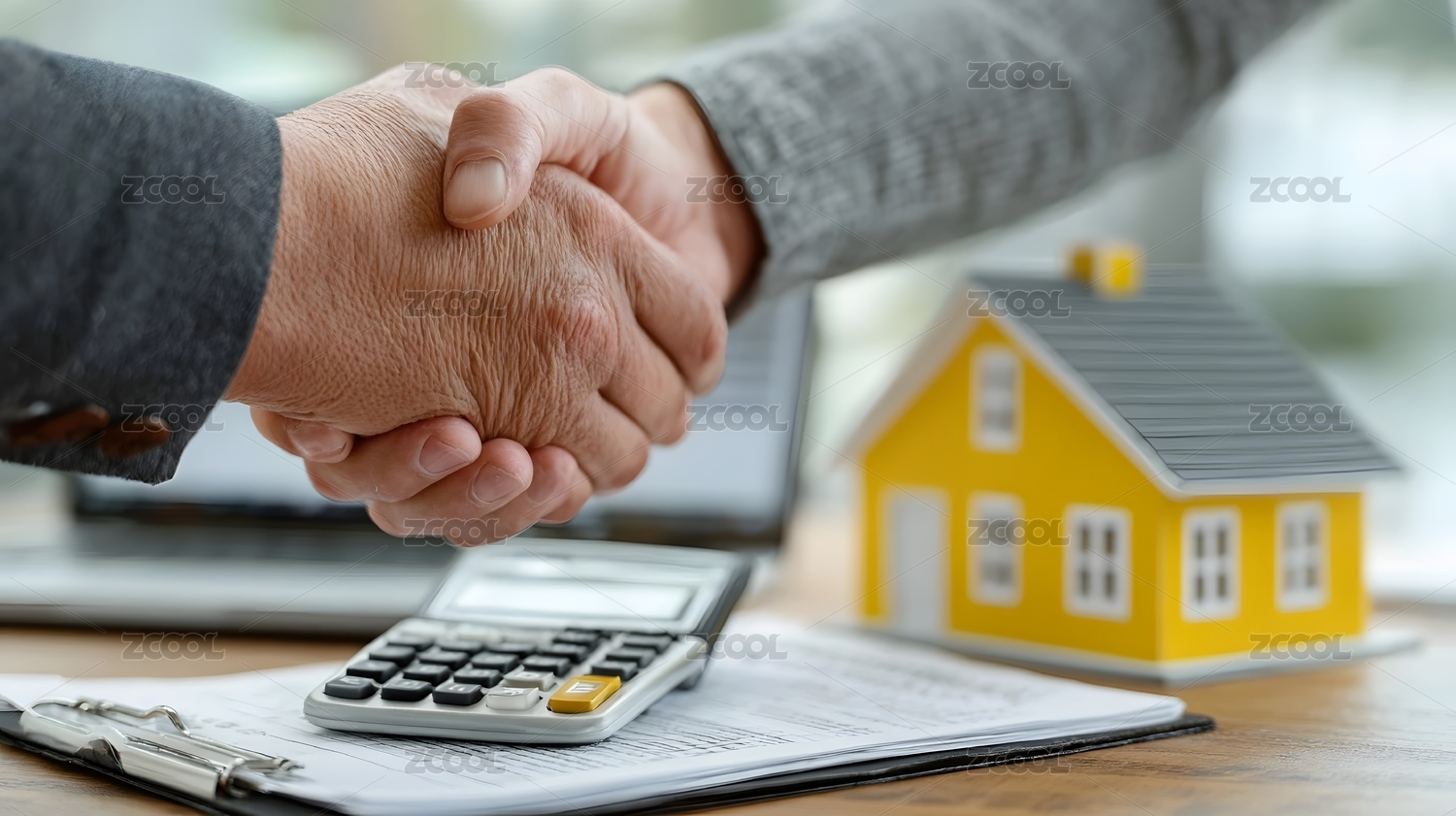 桌子上的小房子模型和坐在桌子旁的销售人员在签署协议