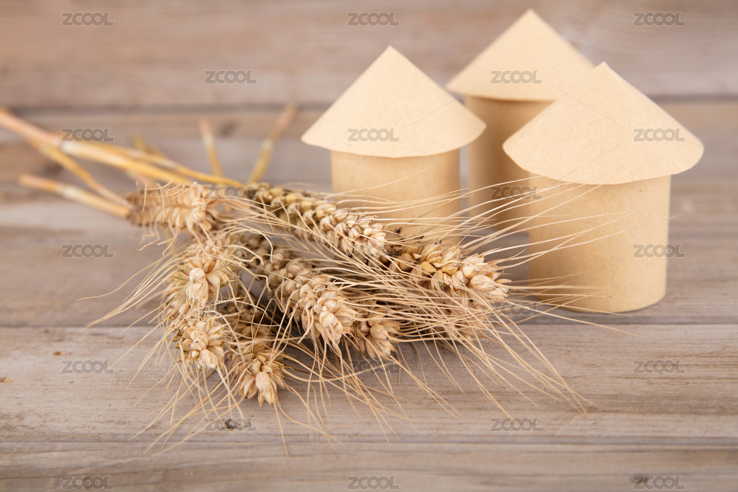 桌子上散落着成熟的麦穗和一个纸糊的粮仓