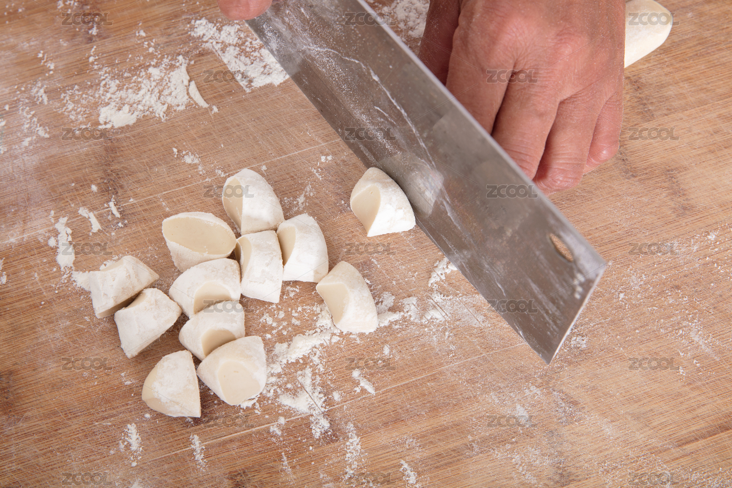 手拿菜刀把长条状的白面在砧板上切成小面团