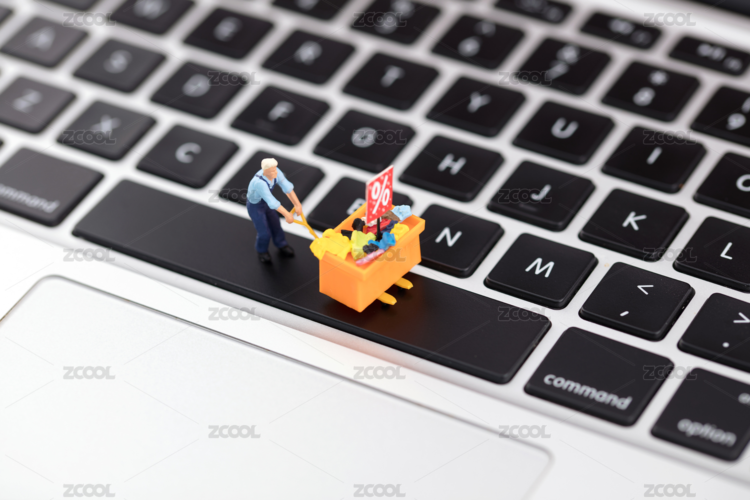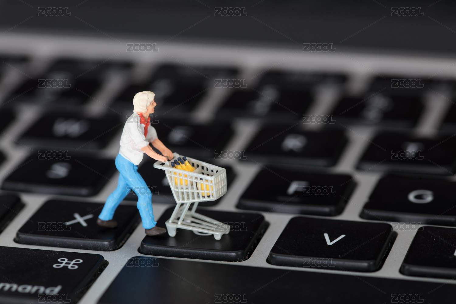微缩模型推着购物车的女士在键盘上