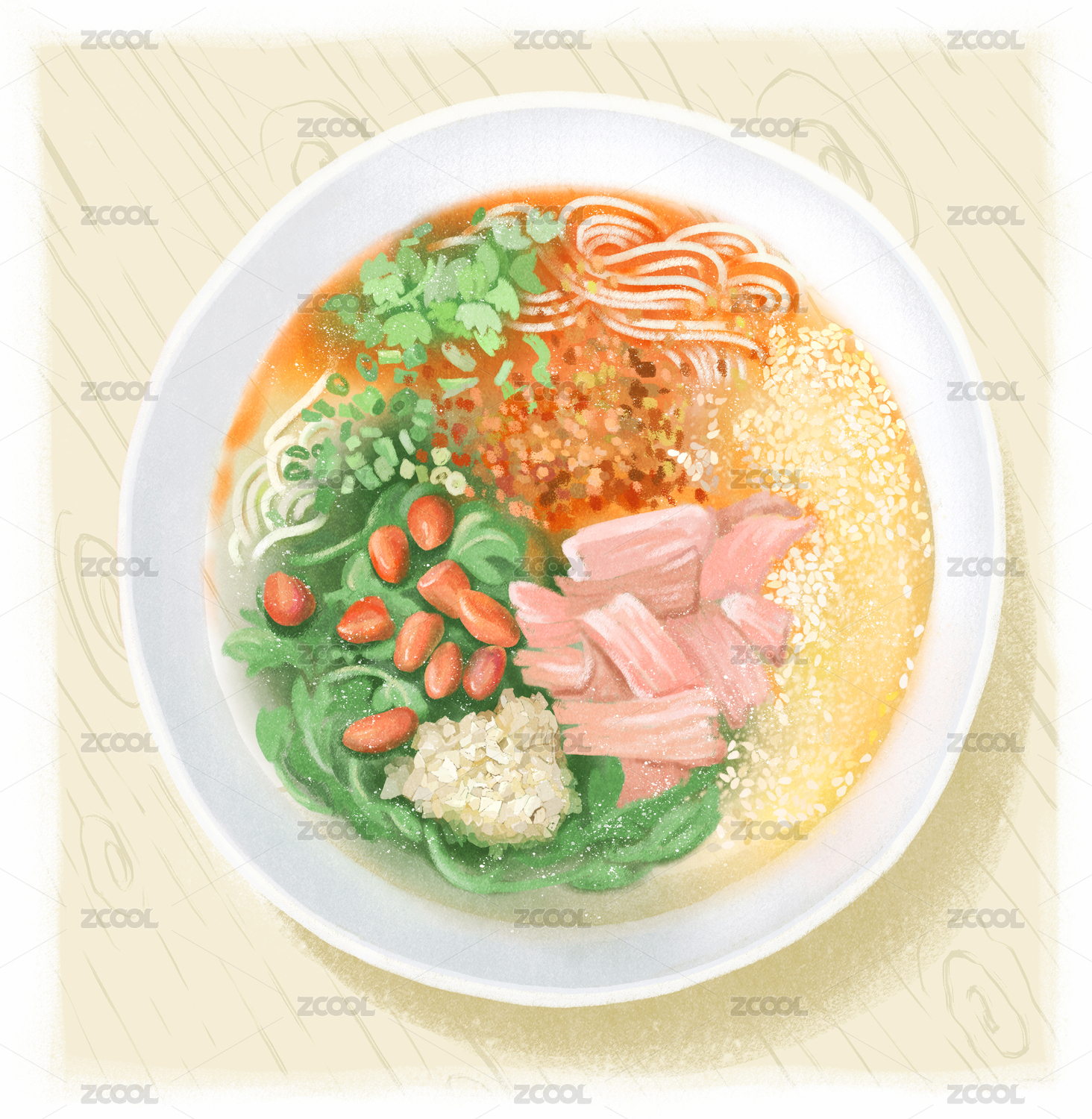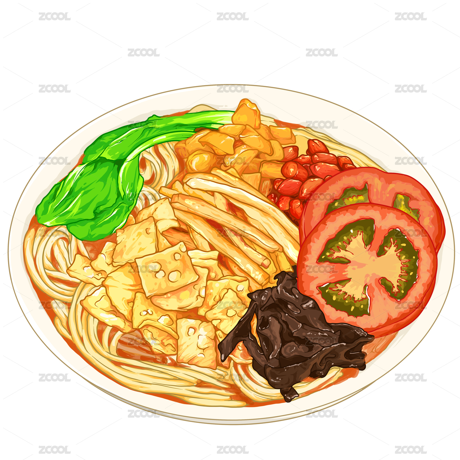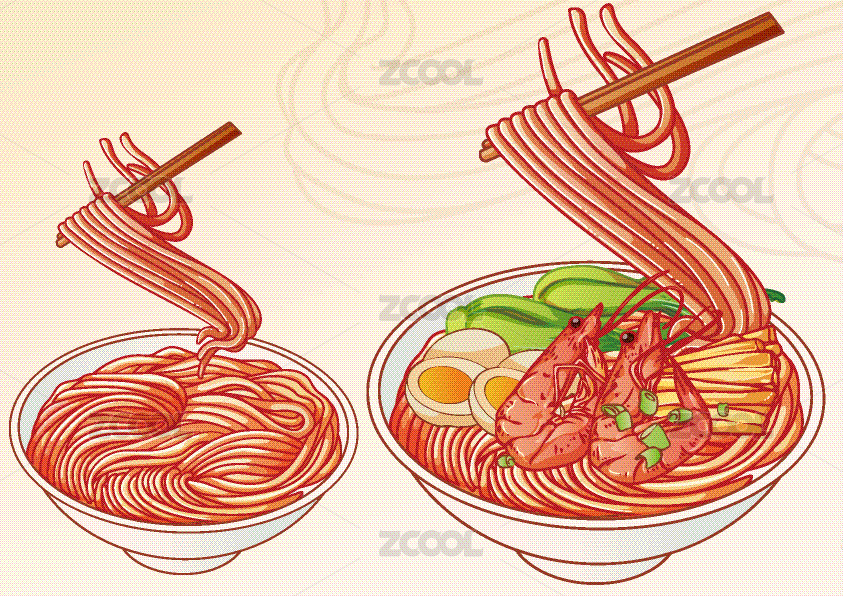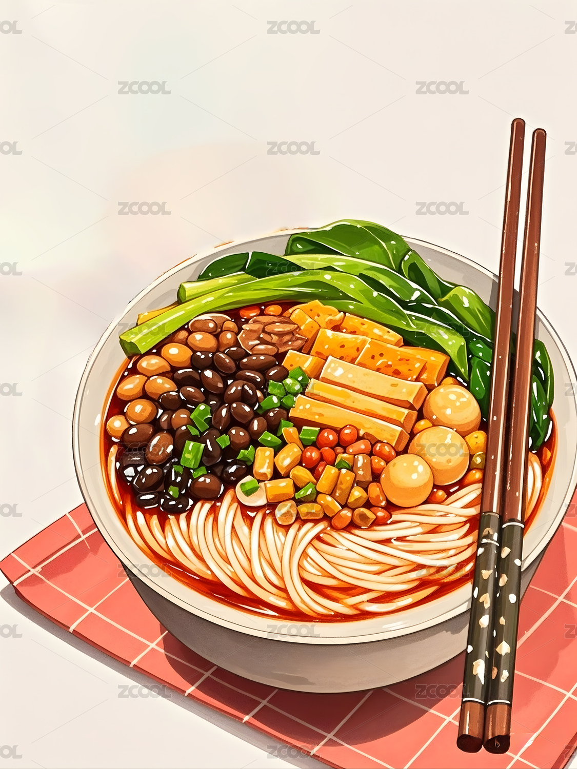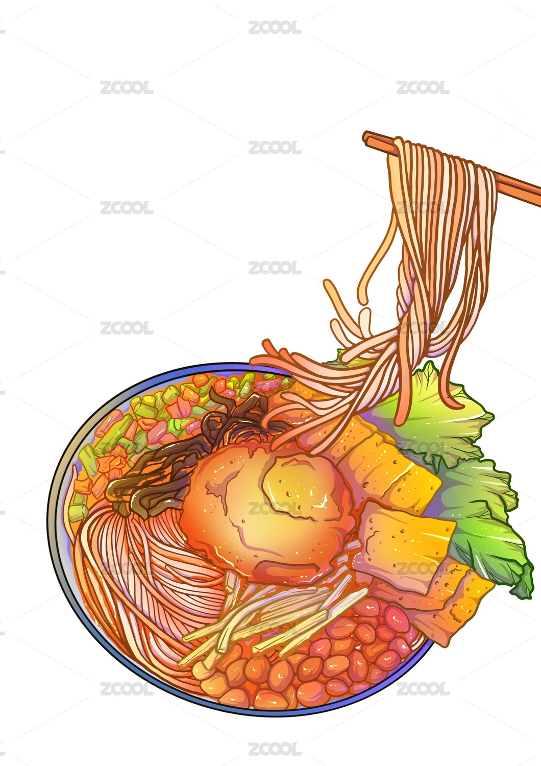 筷子挑起一碗诱人的米粉面条干拌面小吃手绘
