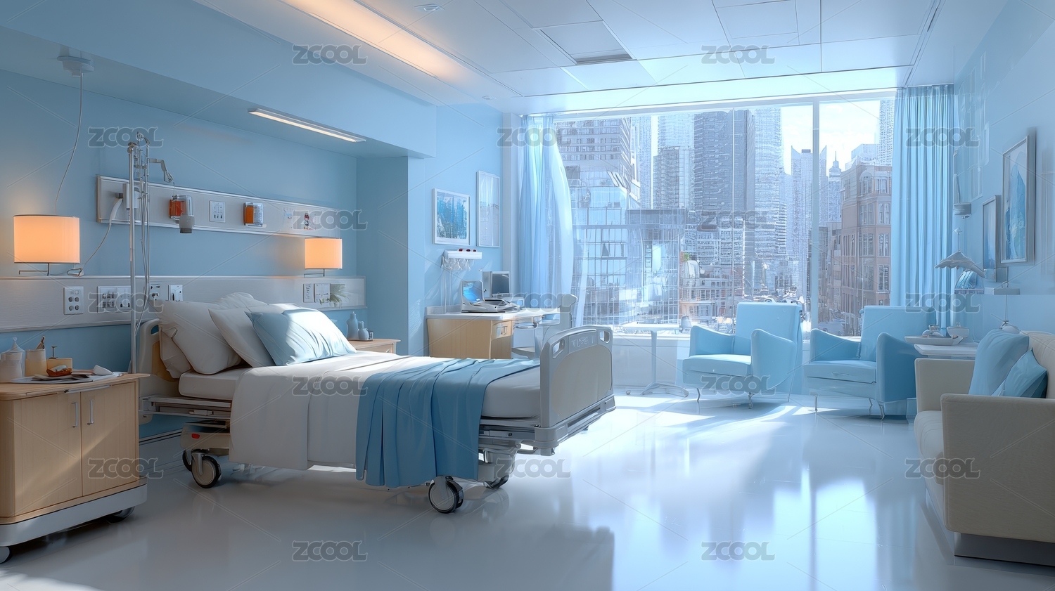 现代化明亮病房带城市景观