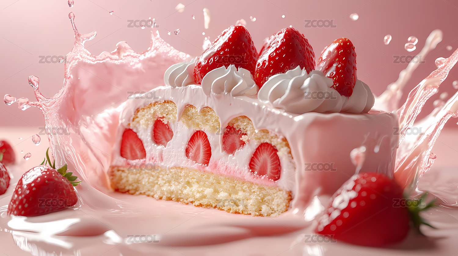 草莓蛋糕与牛奶飞溅