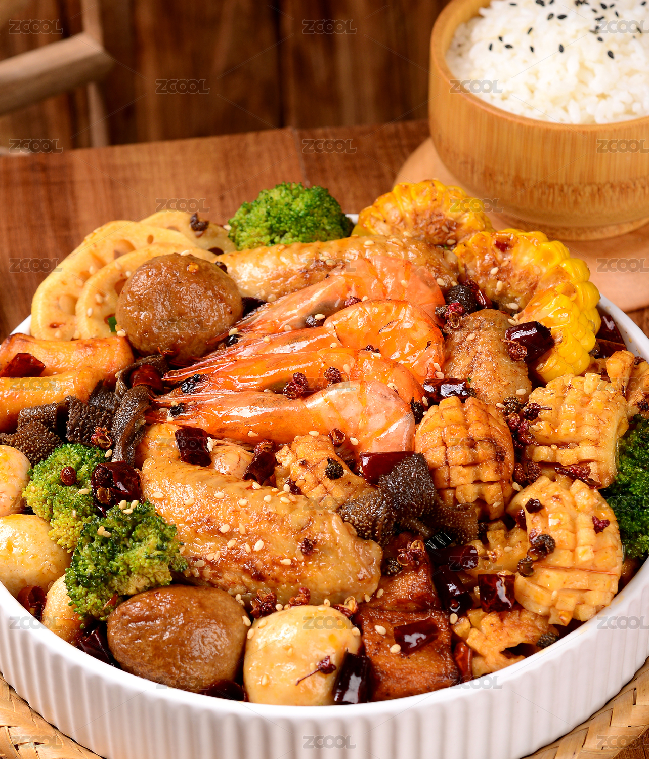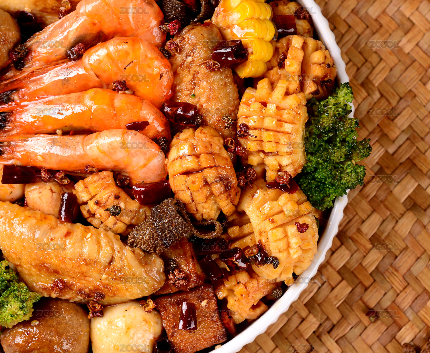 麻辣香锅,干锅冒菜,冒菜,红油冒菜,北极虾,西蓝花,鹌鹑蛋,鱿鱼花,海鲜,麻辣