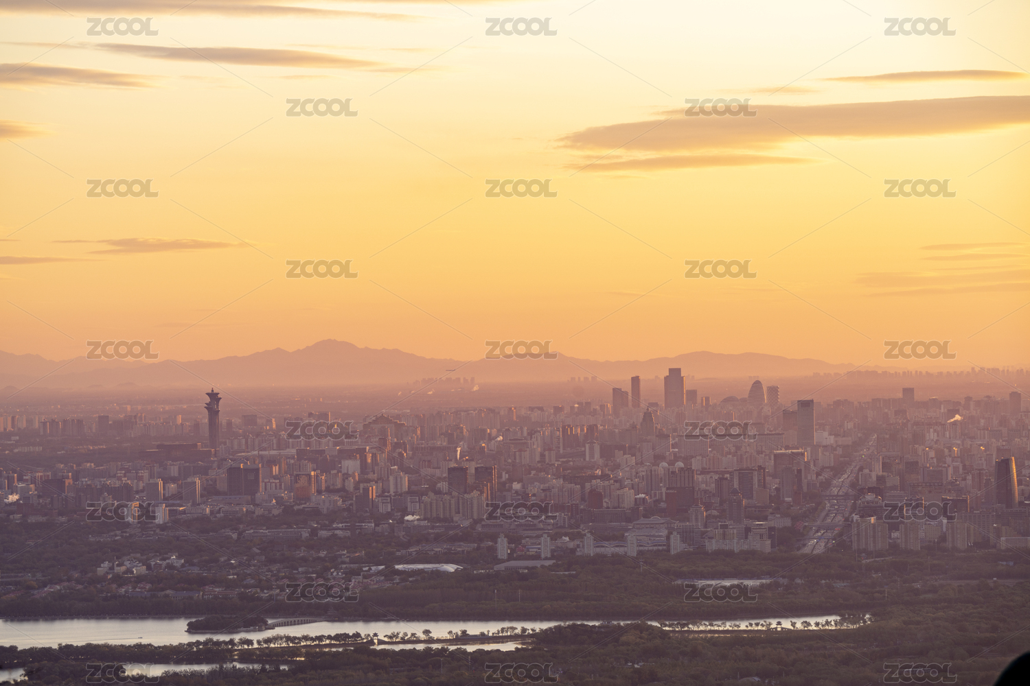 俯瞰黄昏金光中的北京繁华城市密集建筑群