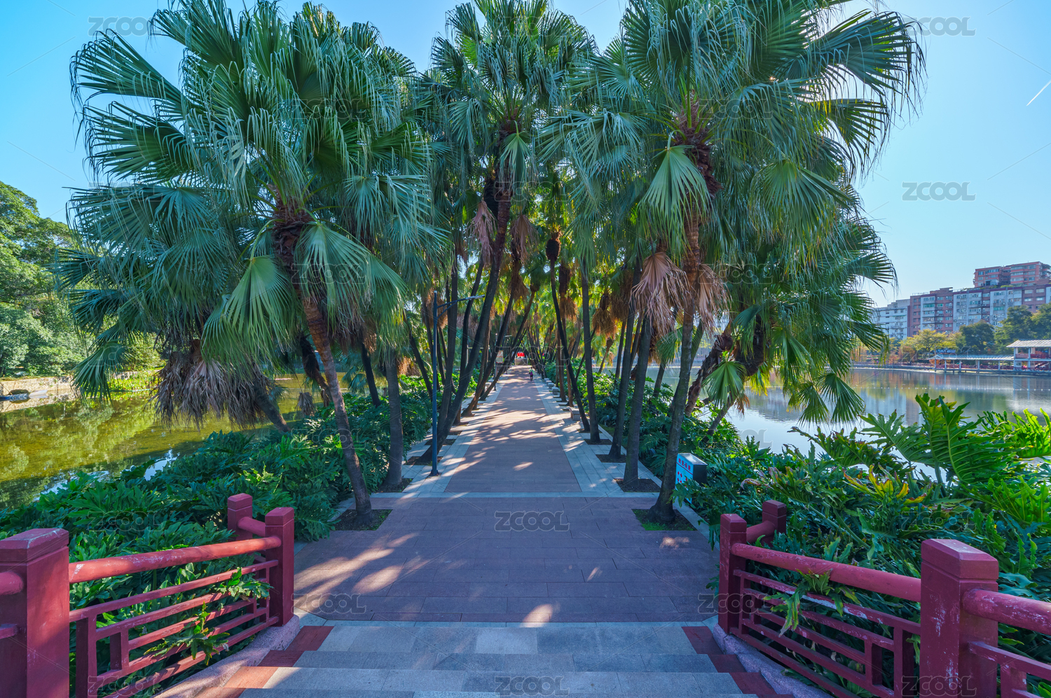 广西南宁人民公园湖心岛棕榈树林与石桥