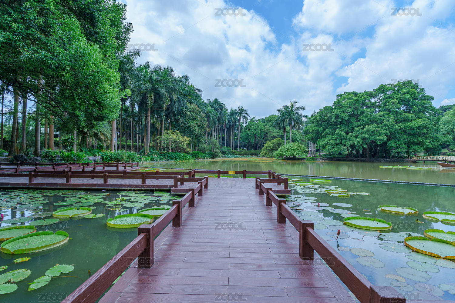 南宁市人民公园荫生植物园湖泊莲叶与栈道
