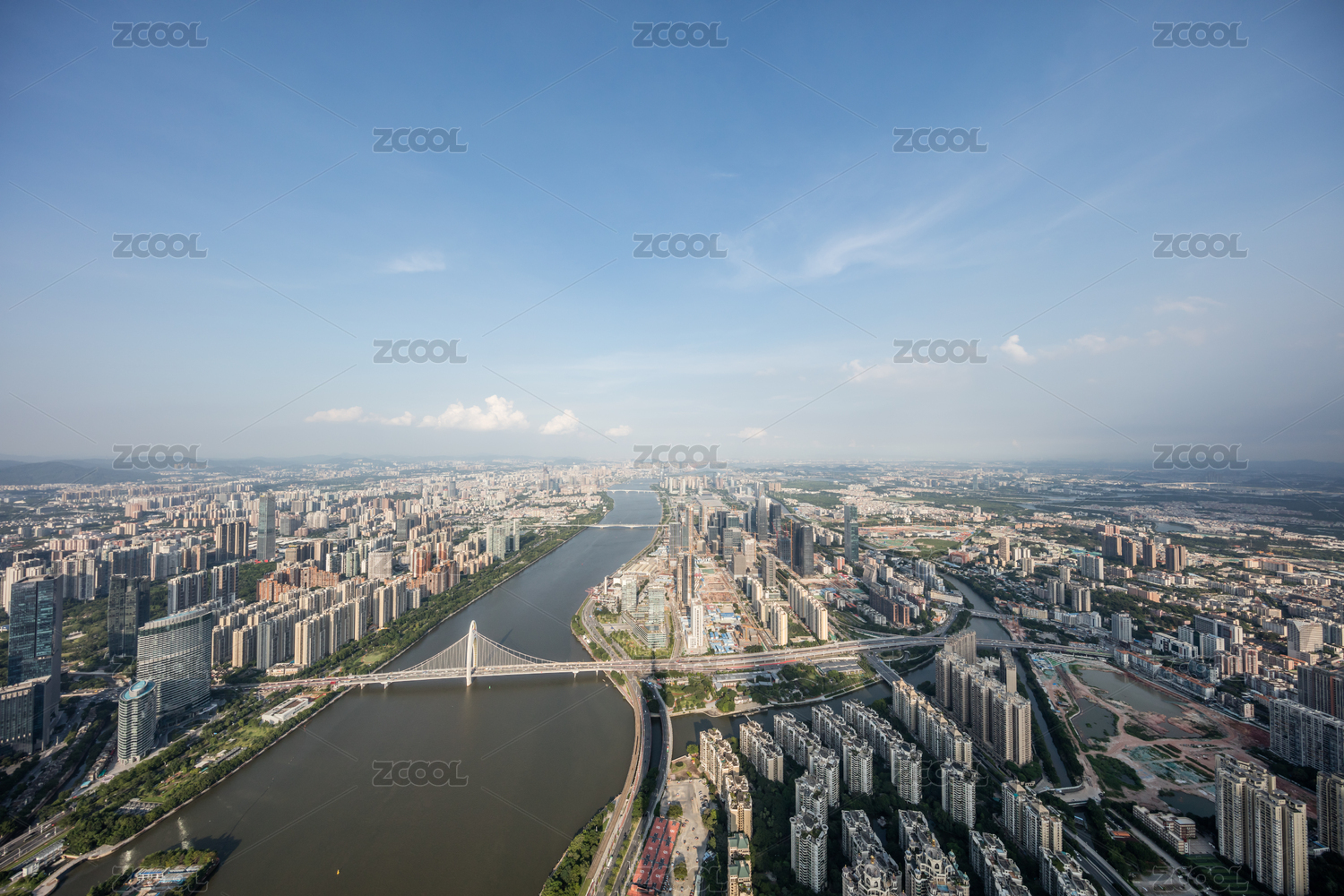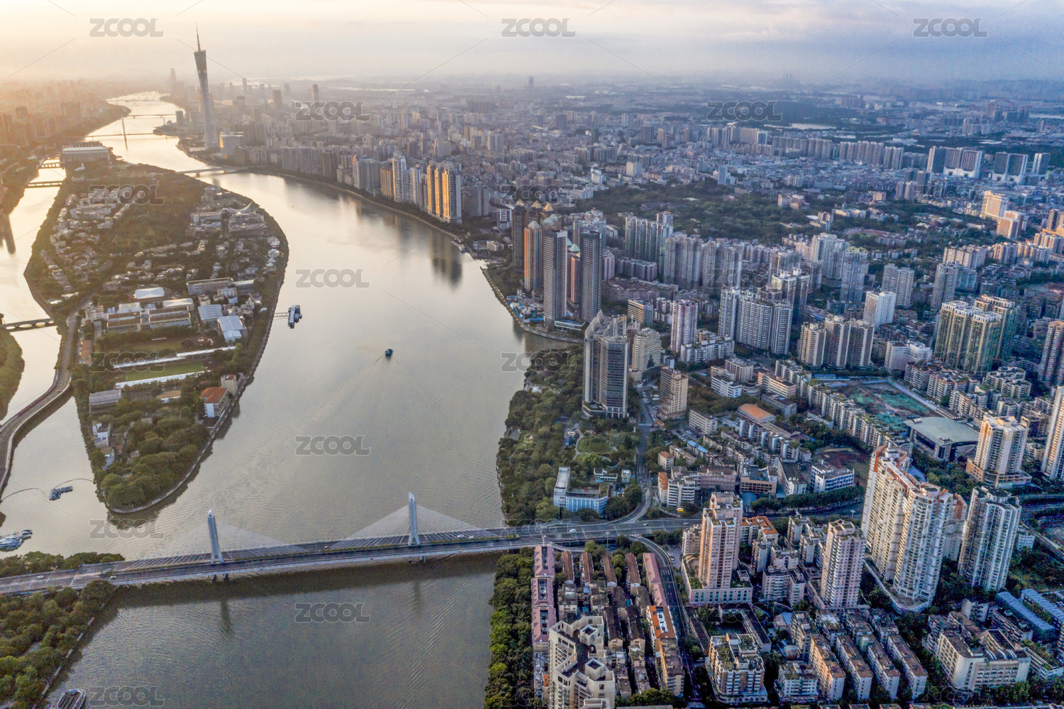 中国广州珠江岸城市建筑夕阳晚霞航拍风光