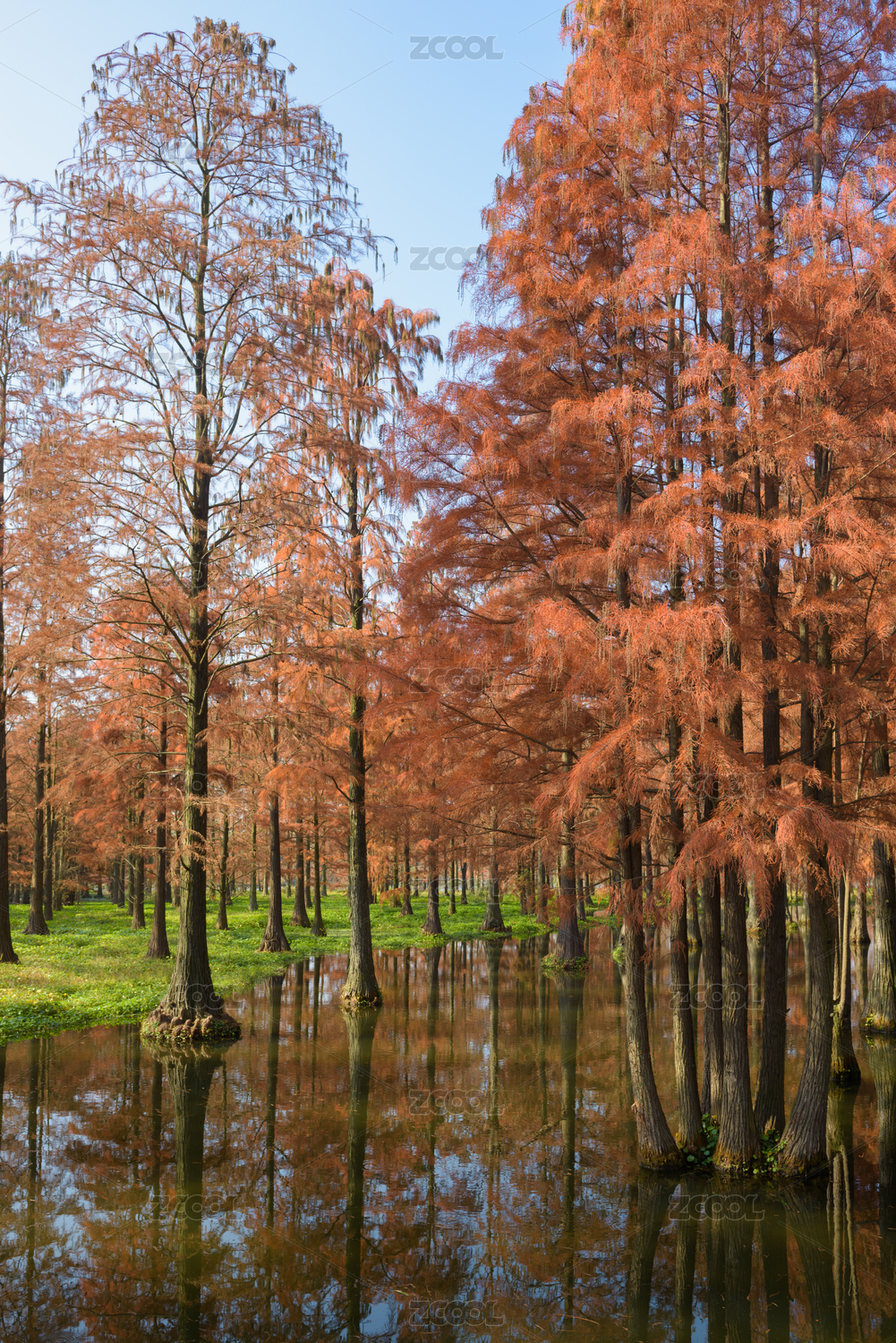 深秋虎丘湿地公园水杉树在湖面的倒影景色
