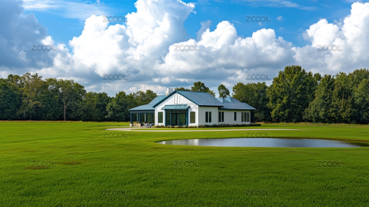 蓝天白云下草地湖面及远处的建筑