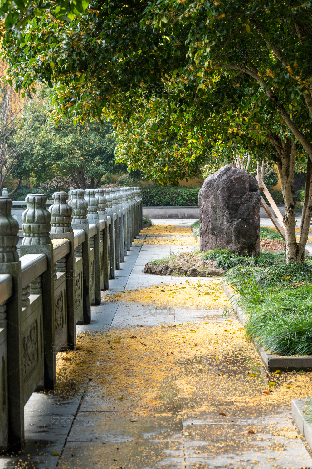 深圳荔枝公园阳光下的中式雕花栏杆步道景观