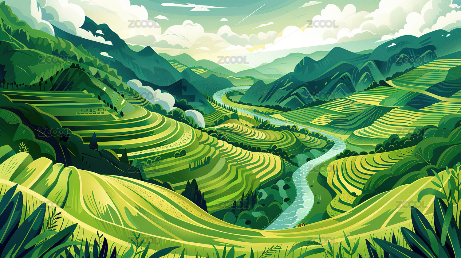 户外,高山,风景,地形,插画,自然,旅行,农业,梯田,宁静